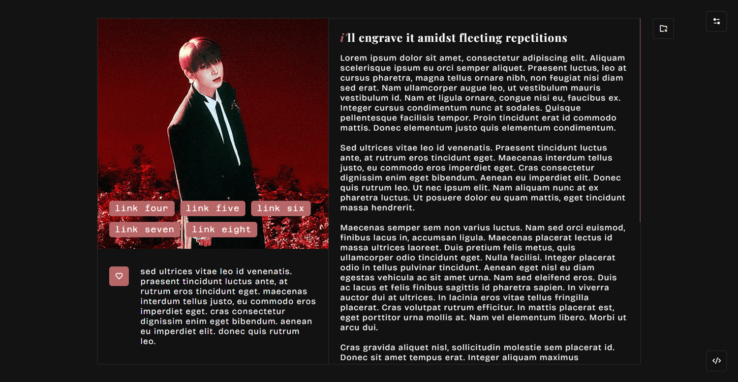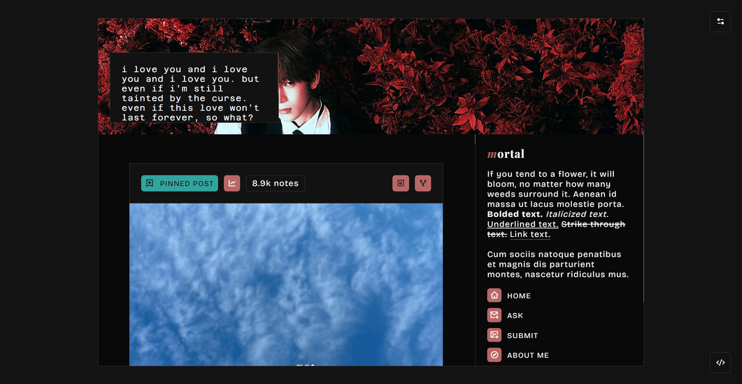 notes: please check your settings if you allow people to ask you questions or submit to you things. otherwise, your ask and submit links won’t show. npf posts friendly (+ among other things!). full credits to the resources, scripts and tutorials are found on the bottom right corner. if you found any coding bugs in my work, please send me a message. i will get back to your shortly.