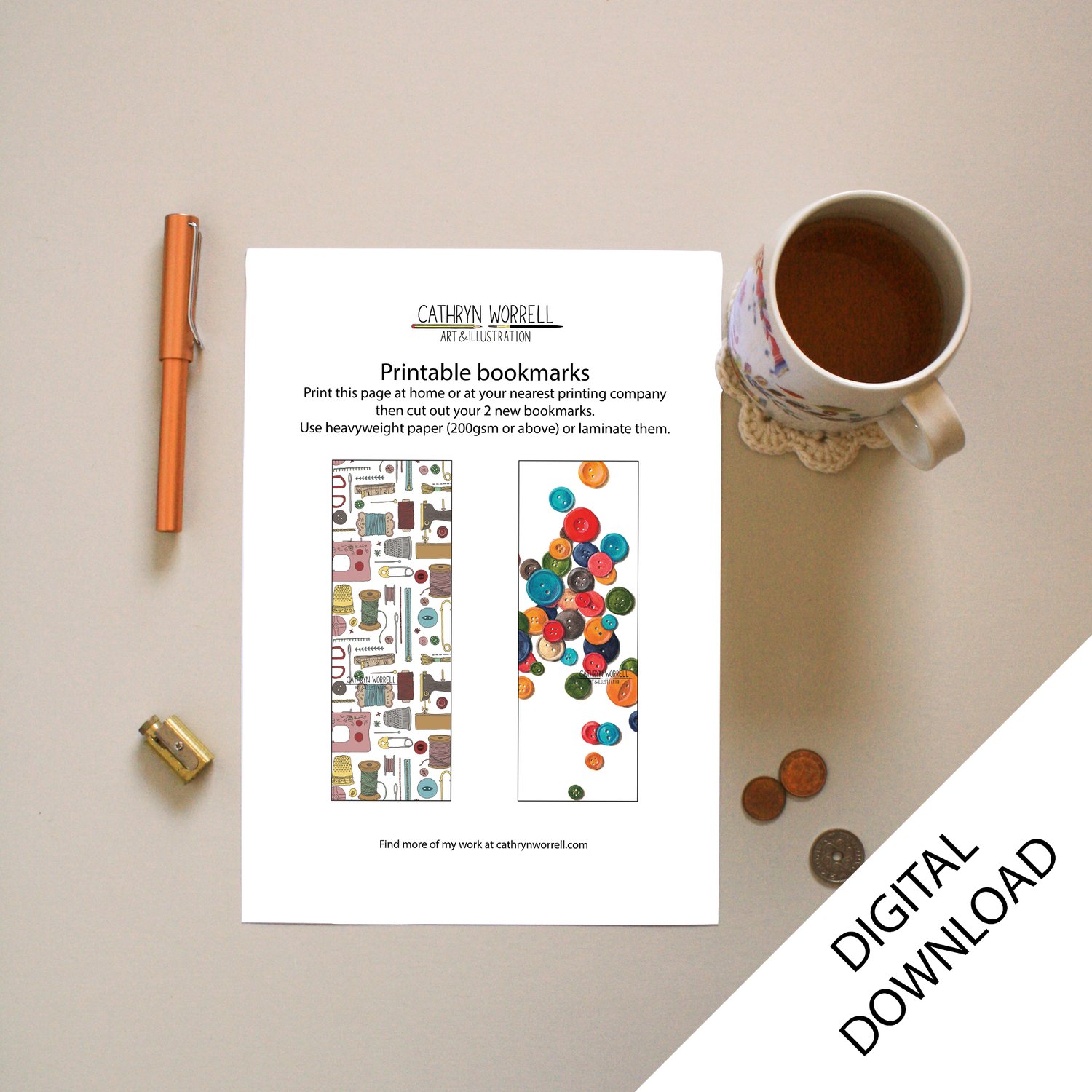 This set of 2 bookmarks feature my hand drawn illustrations of sewing notions and brightly coloured buttons. Print out the file on thick paper or card and cut out each bookmark.