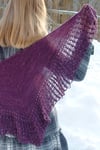 ArachnoShawl is a triangle with a simple stockinette body and beaded cobweb frill border. Dropped stitches produce the open edging, which is worked from the bottom up in a web-like construction studded with shiny beads. This shawl is written in three sizes, with instructions for a Sock yarn shawl, DK shawlette, and a DK shawl; the edging may also be made as wide or as narrow as desired.
