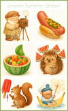 - Whimsical gnome characters living out their best summer days—reading books, relaxing with drinks, harvesting fresh produce, and adventuring with animal friends