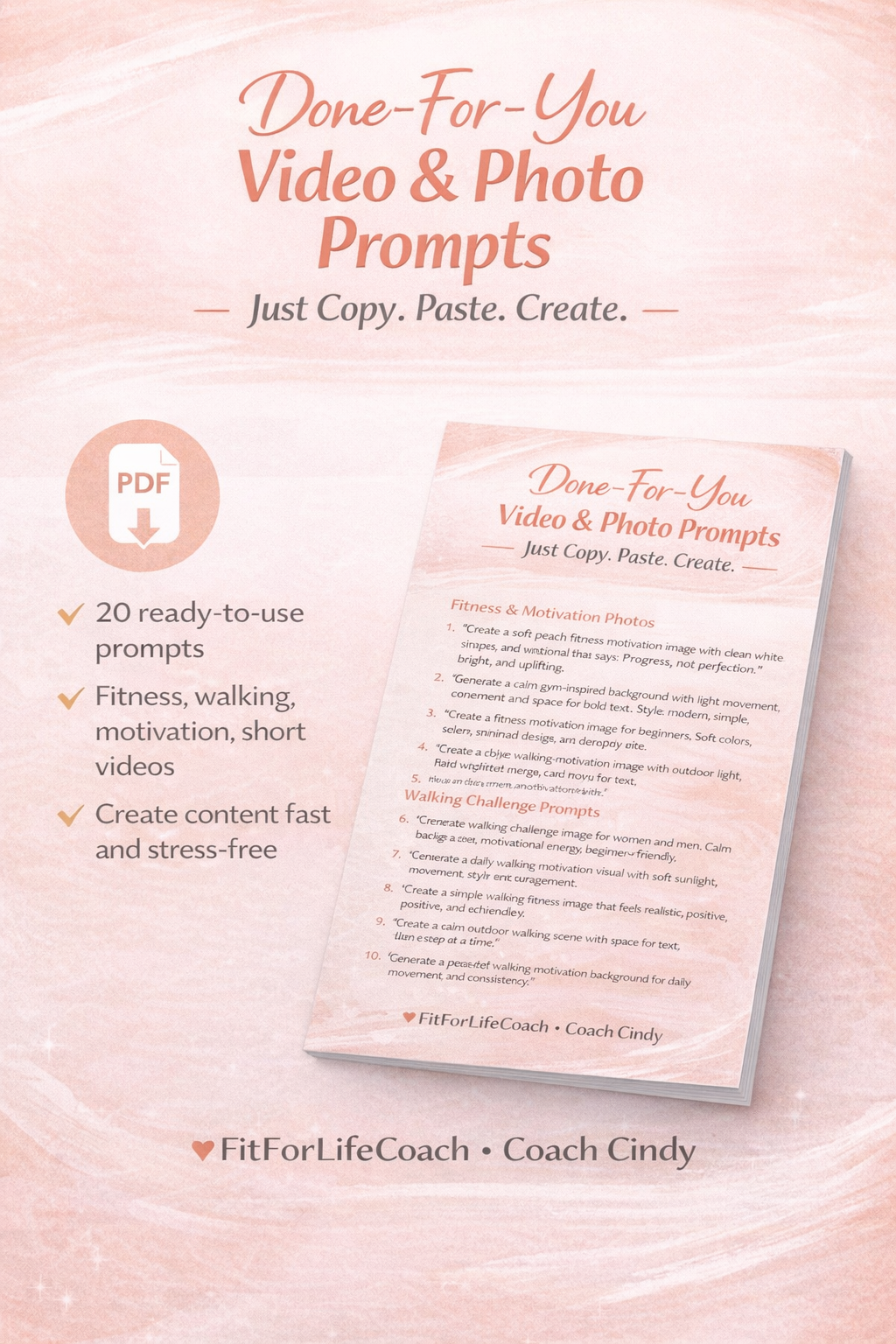 Take the guesswork out of content creation! This ready-to-use PDF includes 20 prompts for fitness, walking, and motivational visuals, along with short videos. Perfect for busy creators, small business owners, coaches, and beginners who want to make engaging content fast and stress-free.