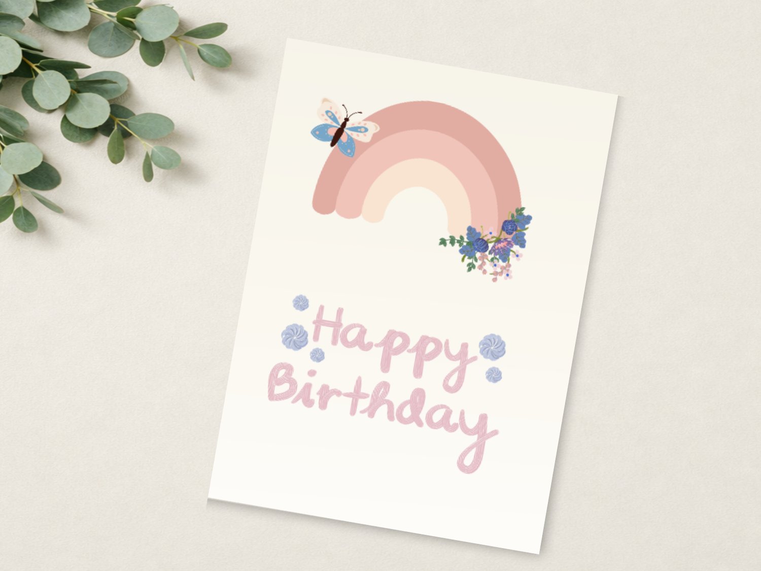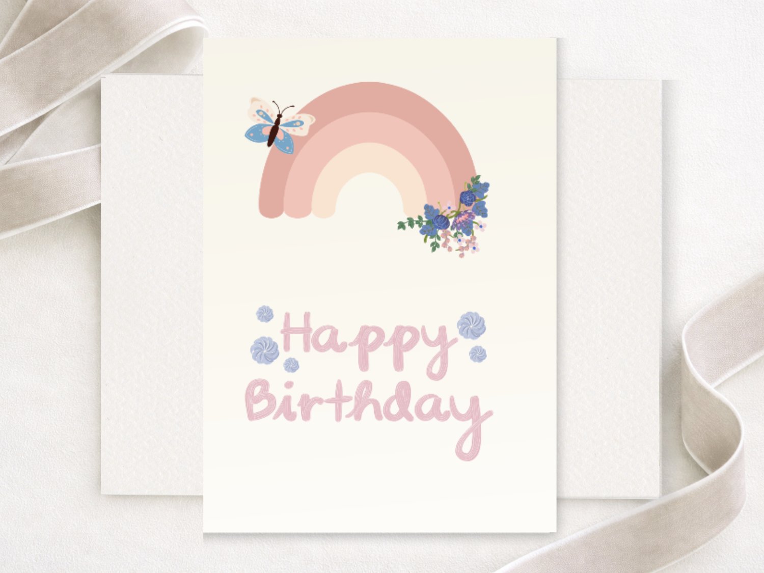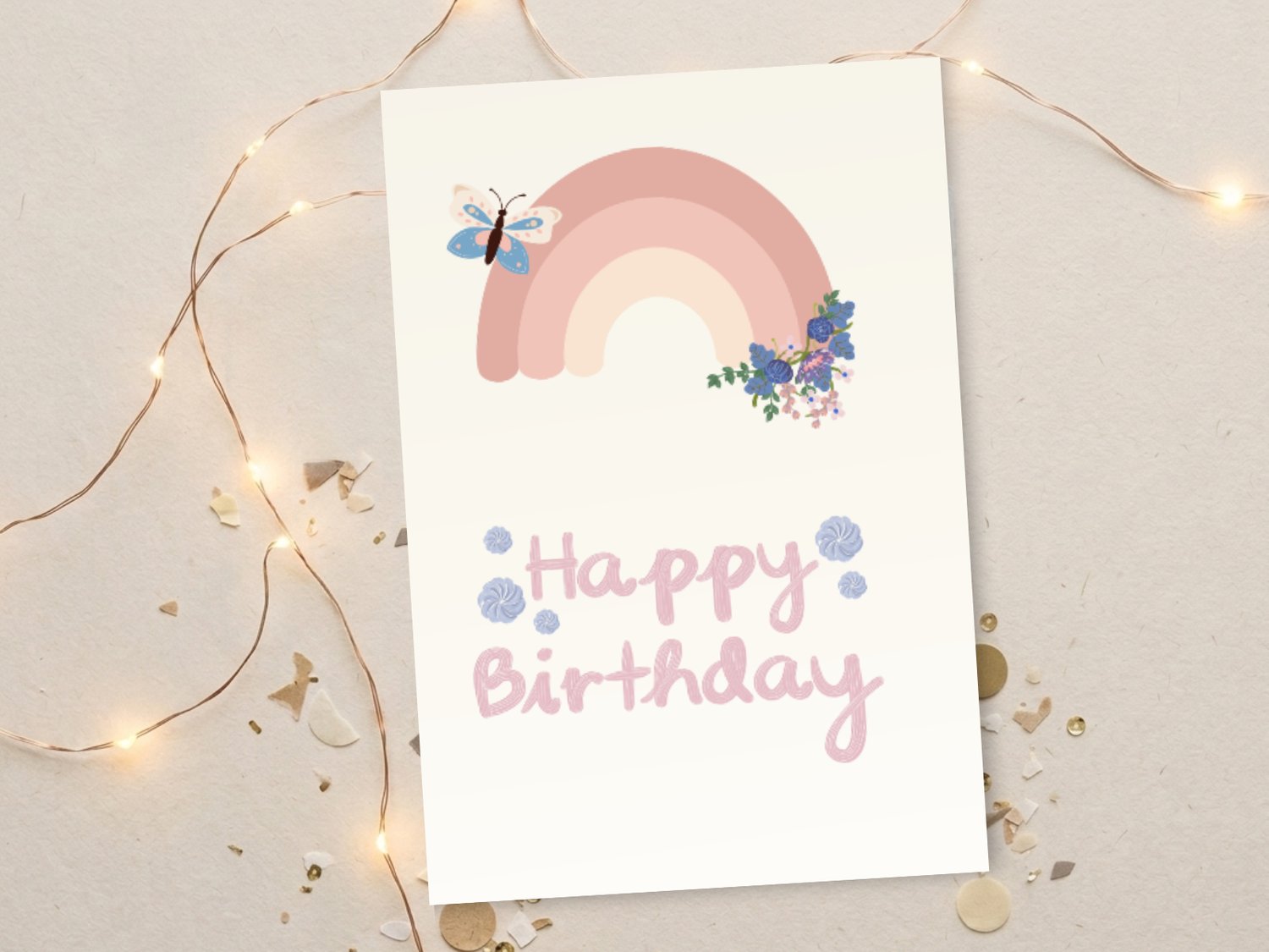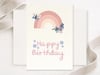 Celebrate in style with this charming boho rainbow birthday card, featuring soft colors, a single butterfly, and a dainty flower – perfect for a gentle, heartfelt greeting.