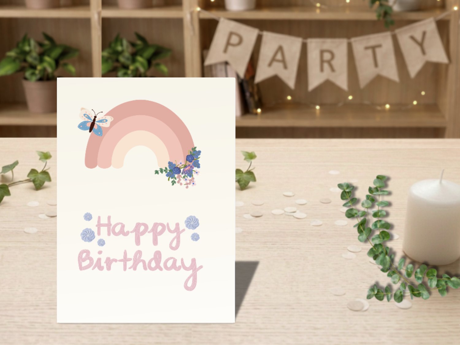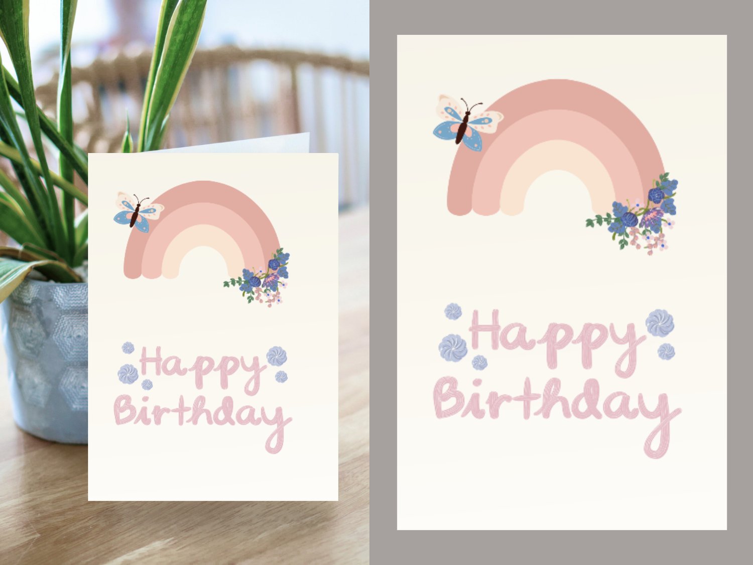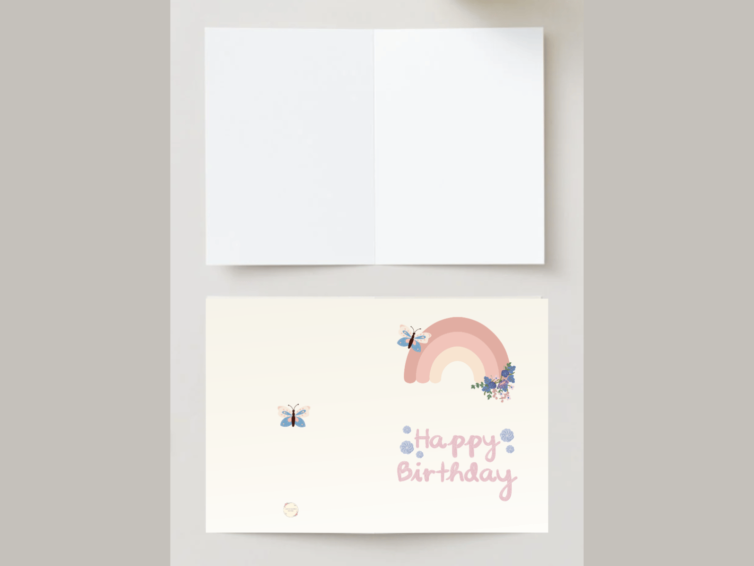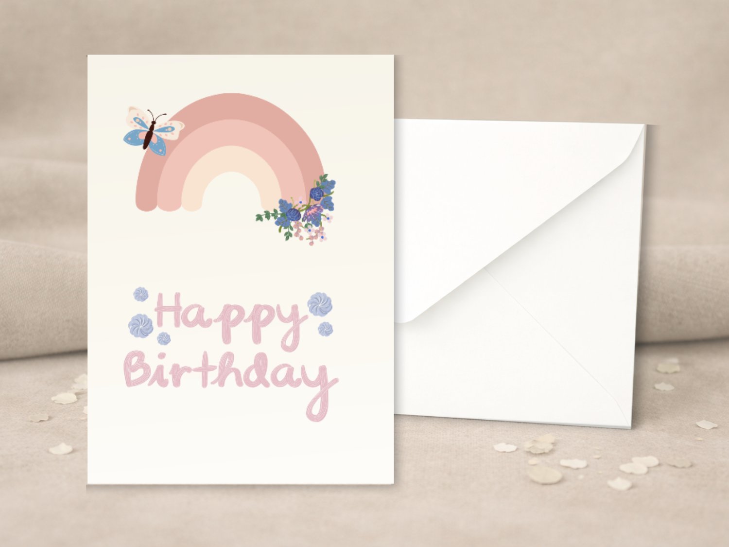 Celebrate in style with this charming boho rainbow birthday card, featuring soft colors, a single butterfly, and a dainty flower – perfect for a gentle, heartfelt greeting.
