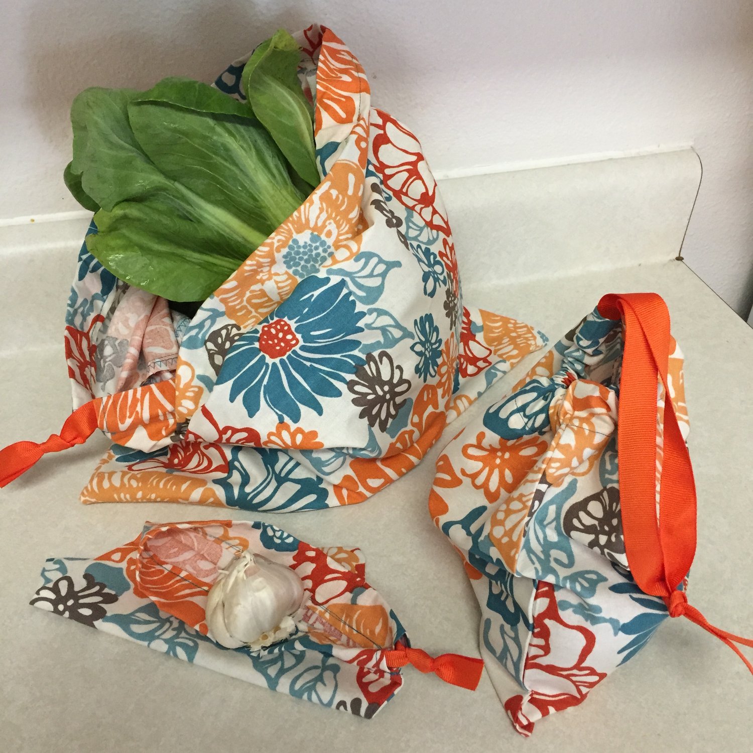 This is a quick and easy pattern to make SIX washable cloth produce bags from just ONE yard of fabric. Sizes are approximately 15’’ x 20’’ (one), 10’’ x 10’’ (four), and 7’’ x 7’’ (one). Use the largest bag for heavy things like oranges and apples, or big leafy bundles of greens. Use the smallest bag for fresh herbs, and things you buy in smaller quantities like garlic or ginger.