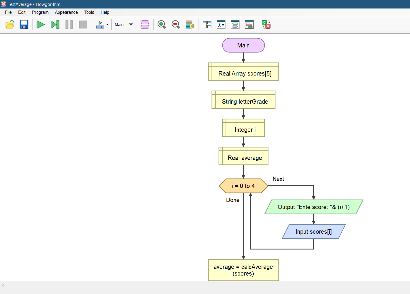 A program that displays a letter grade for each score and the average test score using flowgorithm.