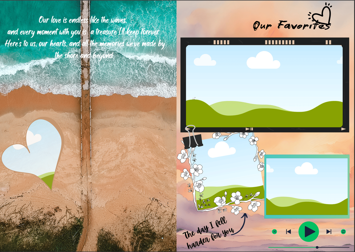 From the first moment you met to your shared adventures, heartfelt letters, and dreams for the future, this scrapbook guides you through a journey of love and connection. With 10 fully editable pages, you can personalize every detail – add your names, special dates, photos, letters, and even little doodles that make your story uniquely yours.