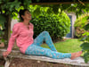 These leggings are worked top-down, in the round for the waist, and seamed rows for the legs. There is short row shaping for your rump and a gusset for your lady area! Legs are worked flat, one at a time using held stitches from the hip section (can be worked simultaneously), and seamed from the ankle up at the end.