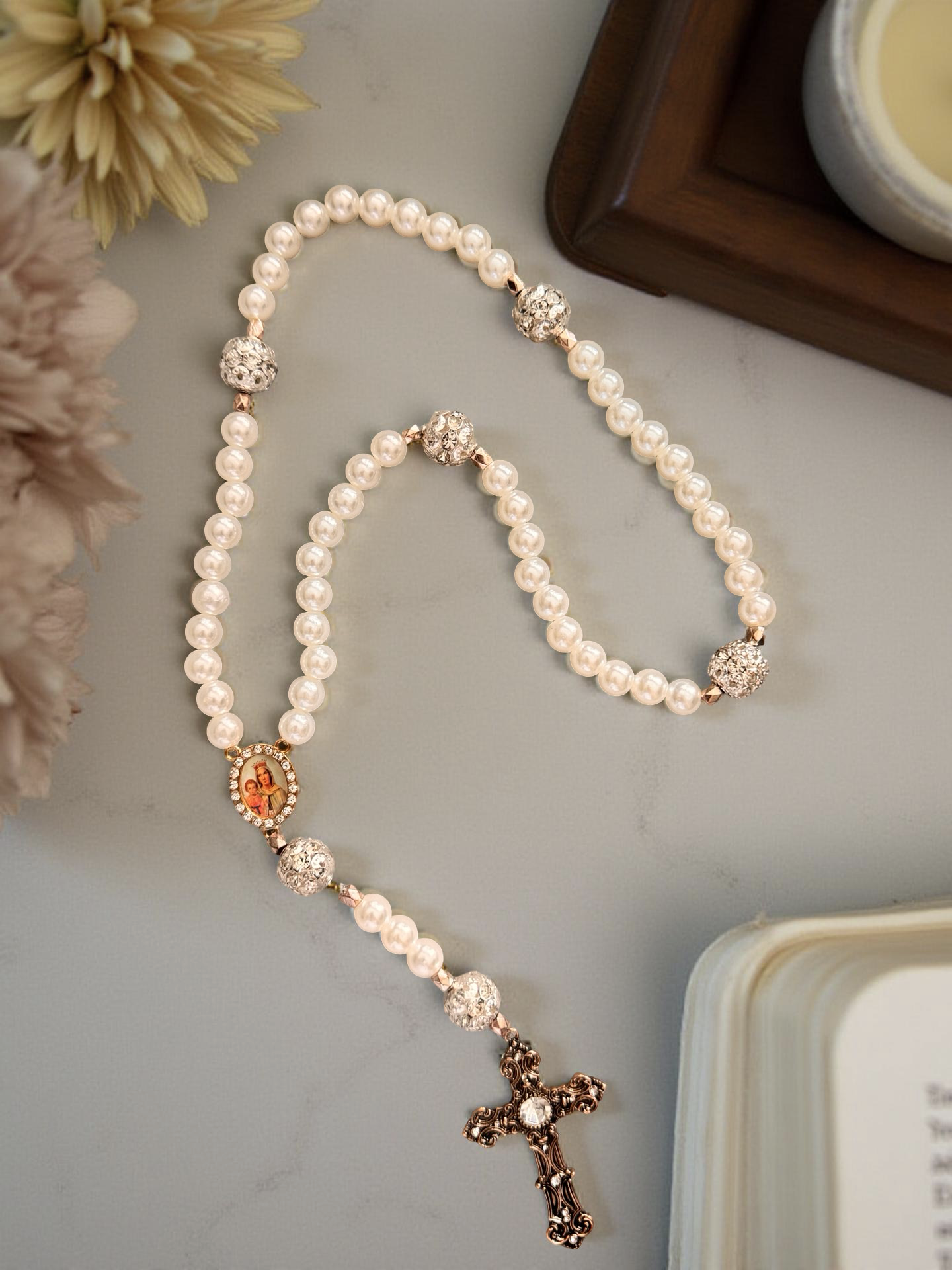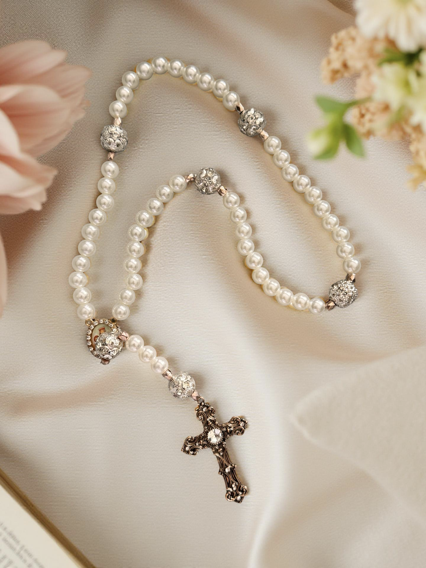 Each rosary is assembled bead by bead with intention and care. The gentle blend of luminous pearl beads, delicate silver accents, and a simple yet elegant cross creates a refined devotional companion meant to be treasured.