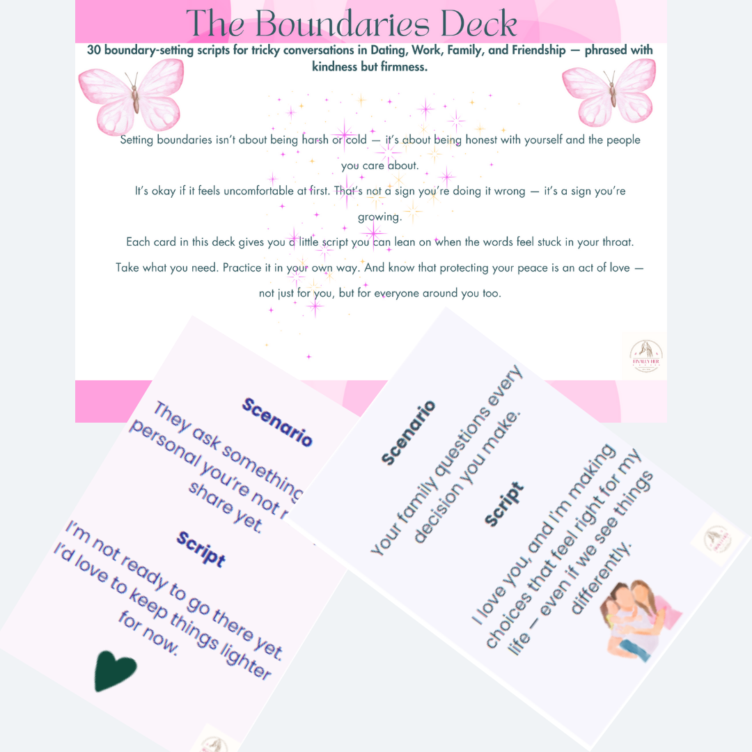 The Boundaries Deck is a 30-card script deck for the moments when speaking up feels hard but necessary. Whether it’s a tough conversation in dating, work, family, or friendship, these scripts help you express your needs with both kindness and clarity.