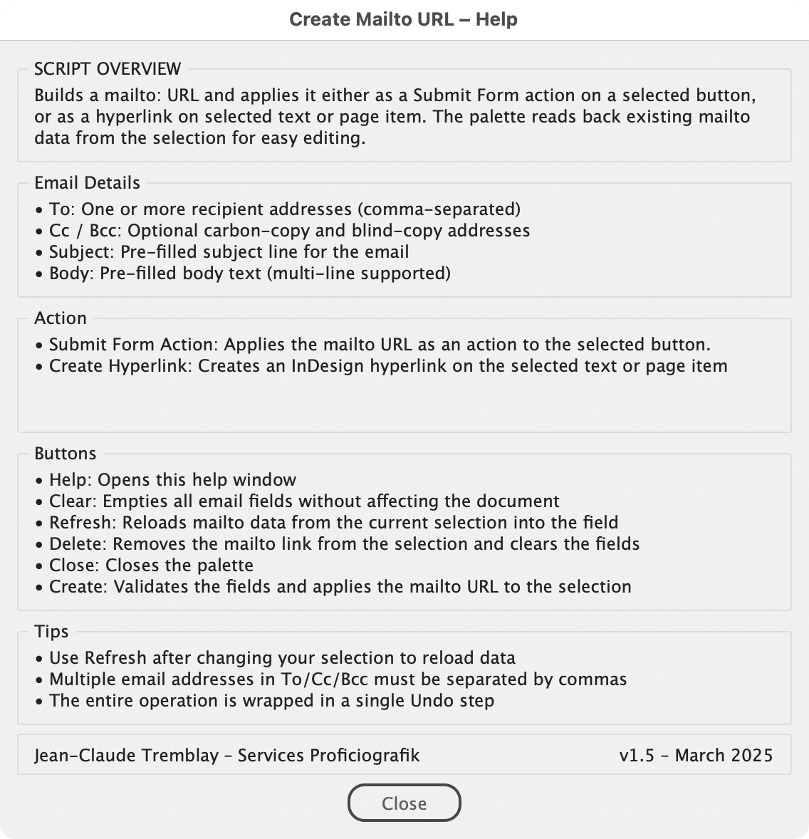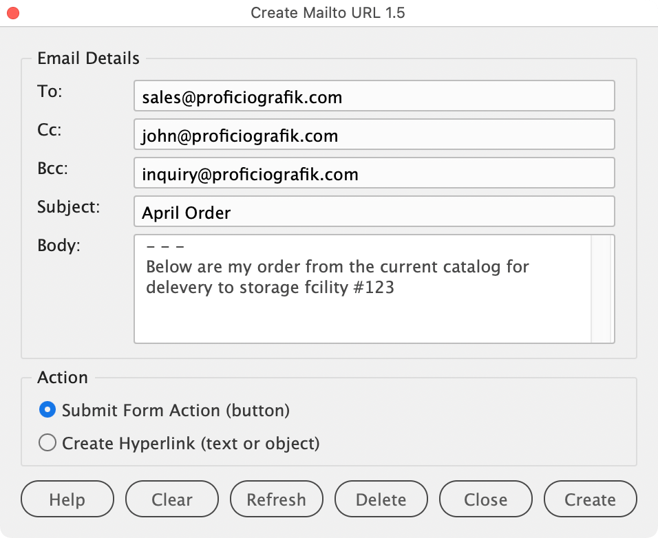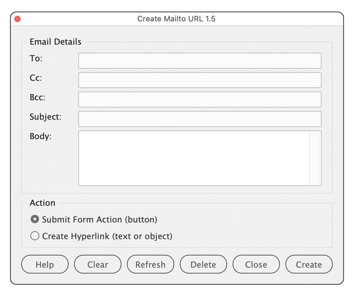 Manually building mailto: URLs with recipients, CC, BCC, subject, and body is tedious and error-prone. This script gives you a persistent palette with a simple form to fill in your email details, validates the addresses, and applies the resulting mailto: URL either as a Submit Form action on a button or as a hyperlink on selected text or object. It also reads back existing mailto: URLs so you can edit them in place, and lets you delete mailto actions or hyperlinks directly from the palette.