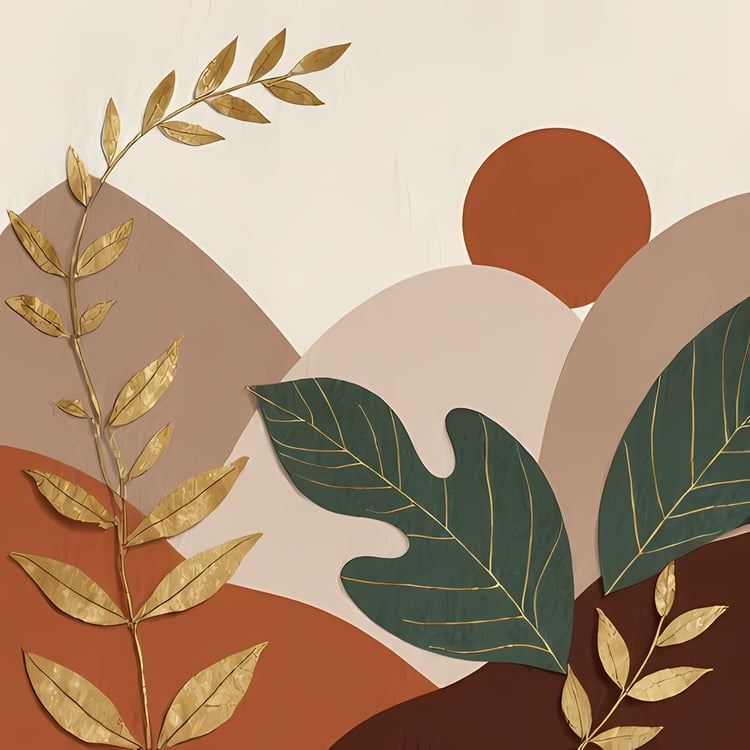 The designs combine geometric shapes with organic elements, creating a modern yet earthy feel. The color palette is centered around rich, warm tones for a contemporary boho look, with hints of green for contrast. Whether you're designing for home décor, branding, greeting cards, or digital art projects, these versatile illustrations will enhance any creative project with their stylish and unique flair.
