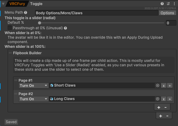 The radial menu toggle is located in the Long Claws prefab, if you are having issues with them not changing in game, edit the prefab and drop in the prefabs in the order the last photo shows and save. The radial menu will default the short claws first.