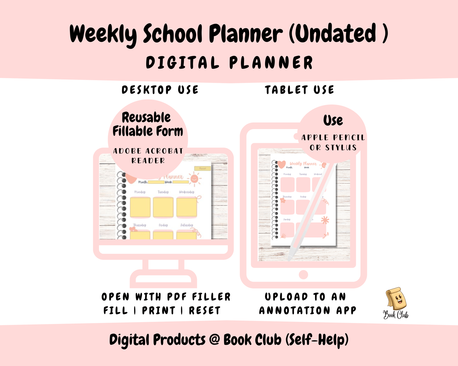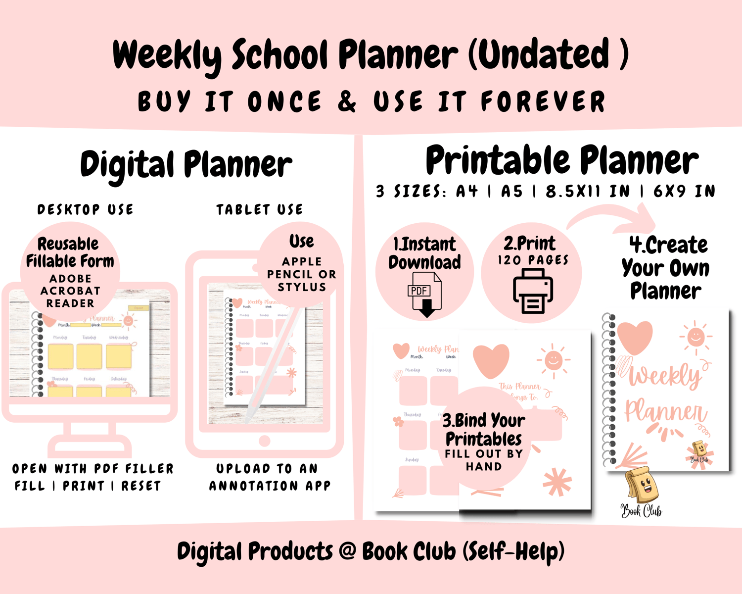 Looking for the perfect planner to effortlessly manage your school schedule with elegance? Our Pastel Pink Weekly School Planner is designed for students and teachers who want to stay on top of assignments, deadlines, and appointmentsโall in one beautiful, easy-to-use place. Undated and versatile, itโs your go-to planner anytime, anywhere! ๐๐