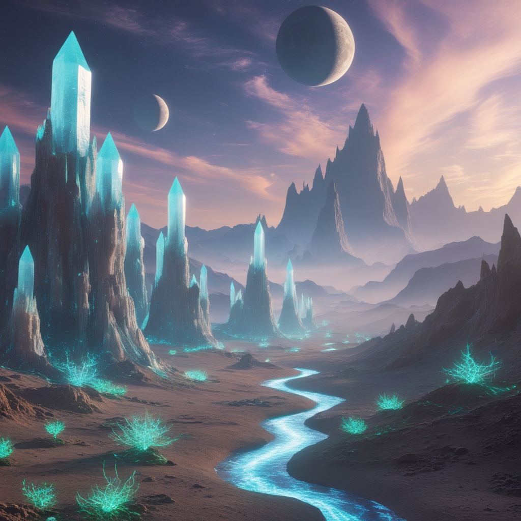 A breathtaking scene of a distant alien planet with a surreal, otherworldly landscape. Towering crystal formations rise from the ground, glowing faintly in shades of turquoise and violet. Bioluminescent plants illuminate the terrain with soft neon blues and greens. The sky is filled with swirling pastel-colored nebula clouds, and two massive moons hang low on the horizon.
