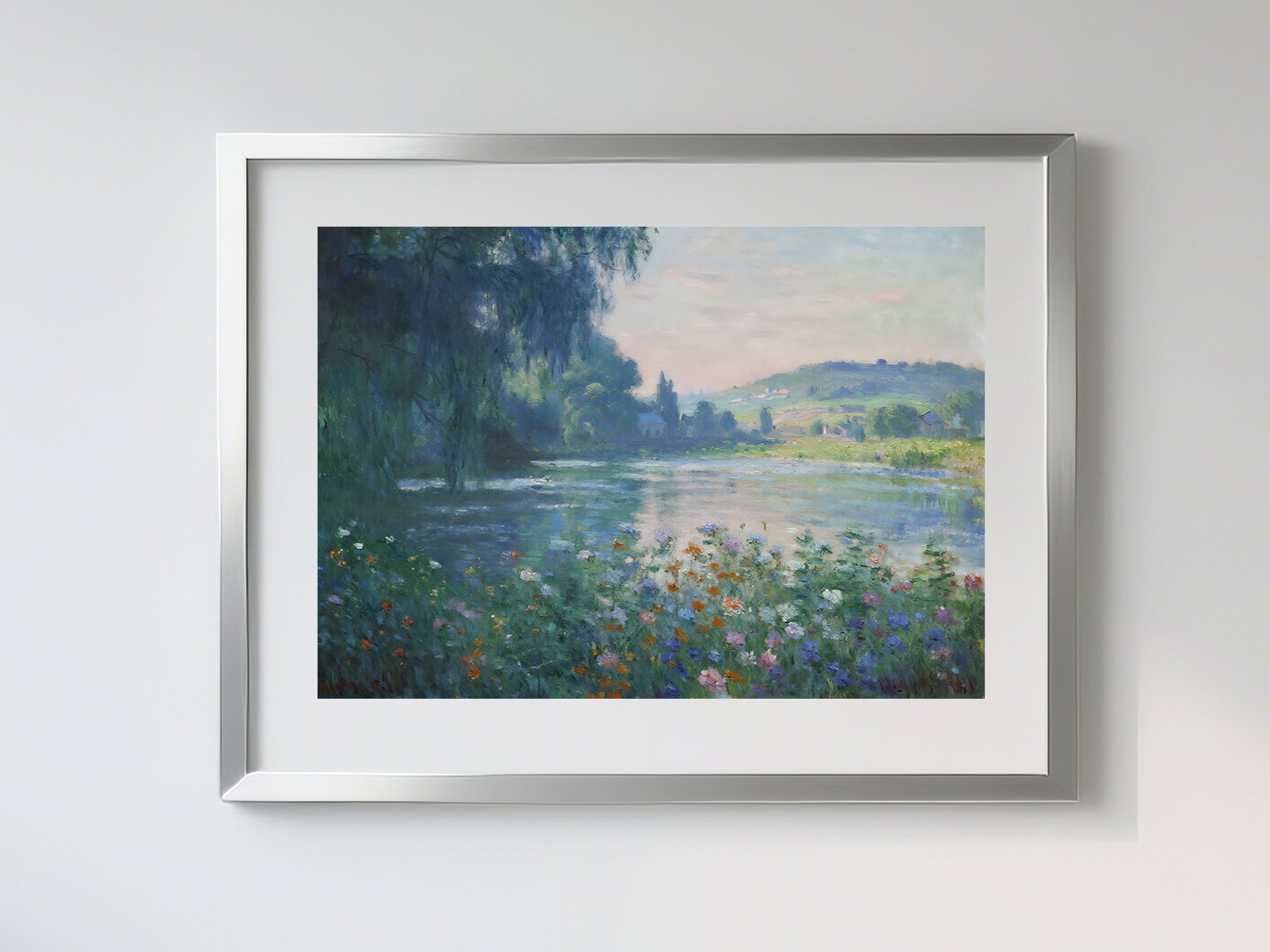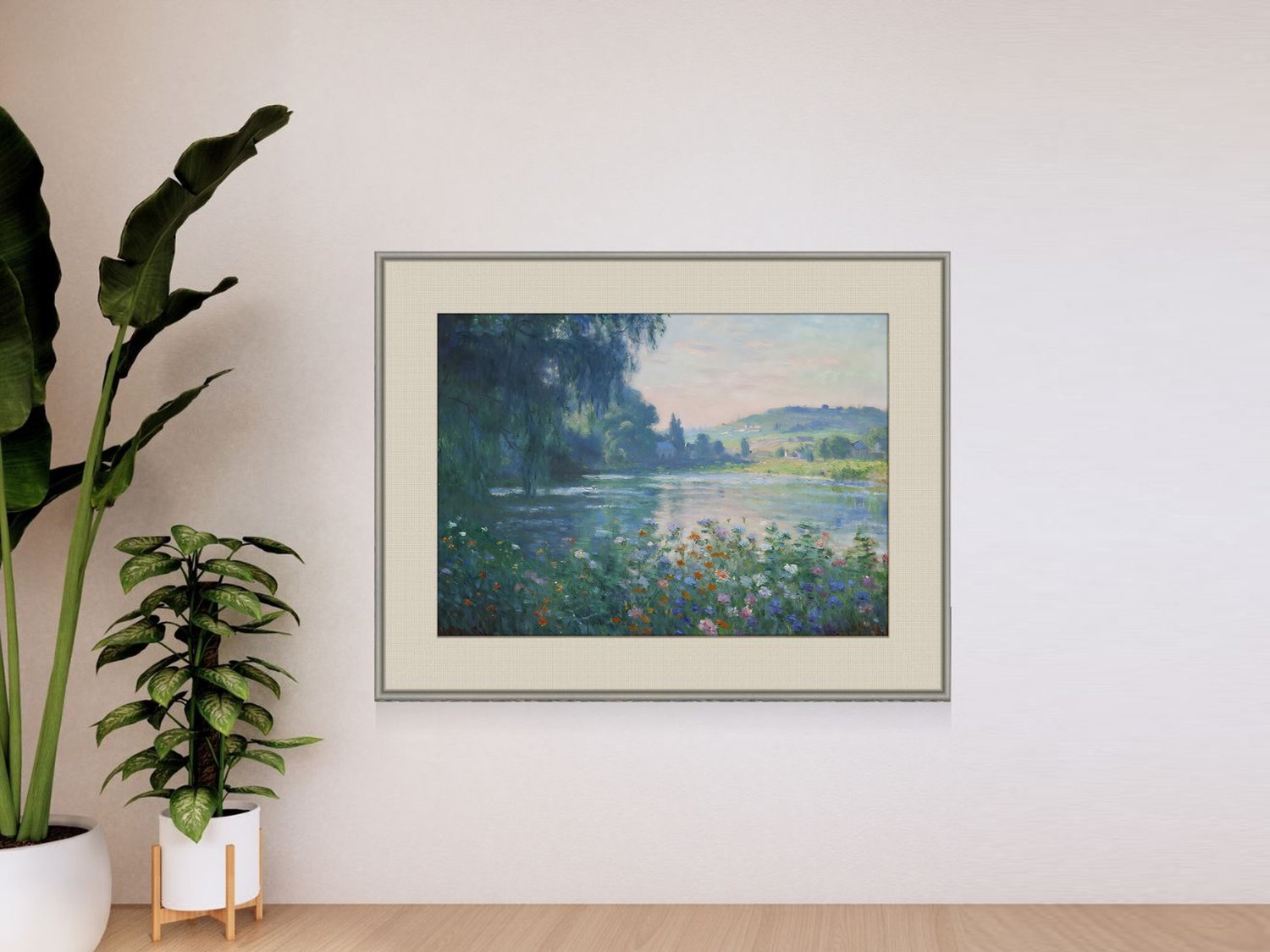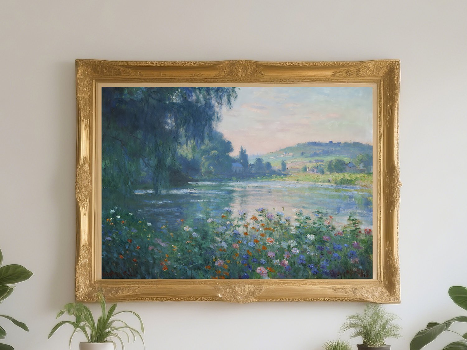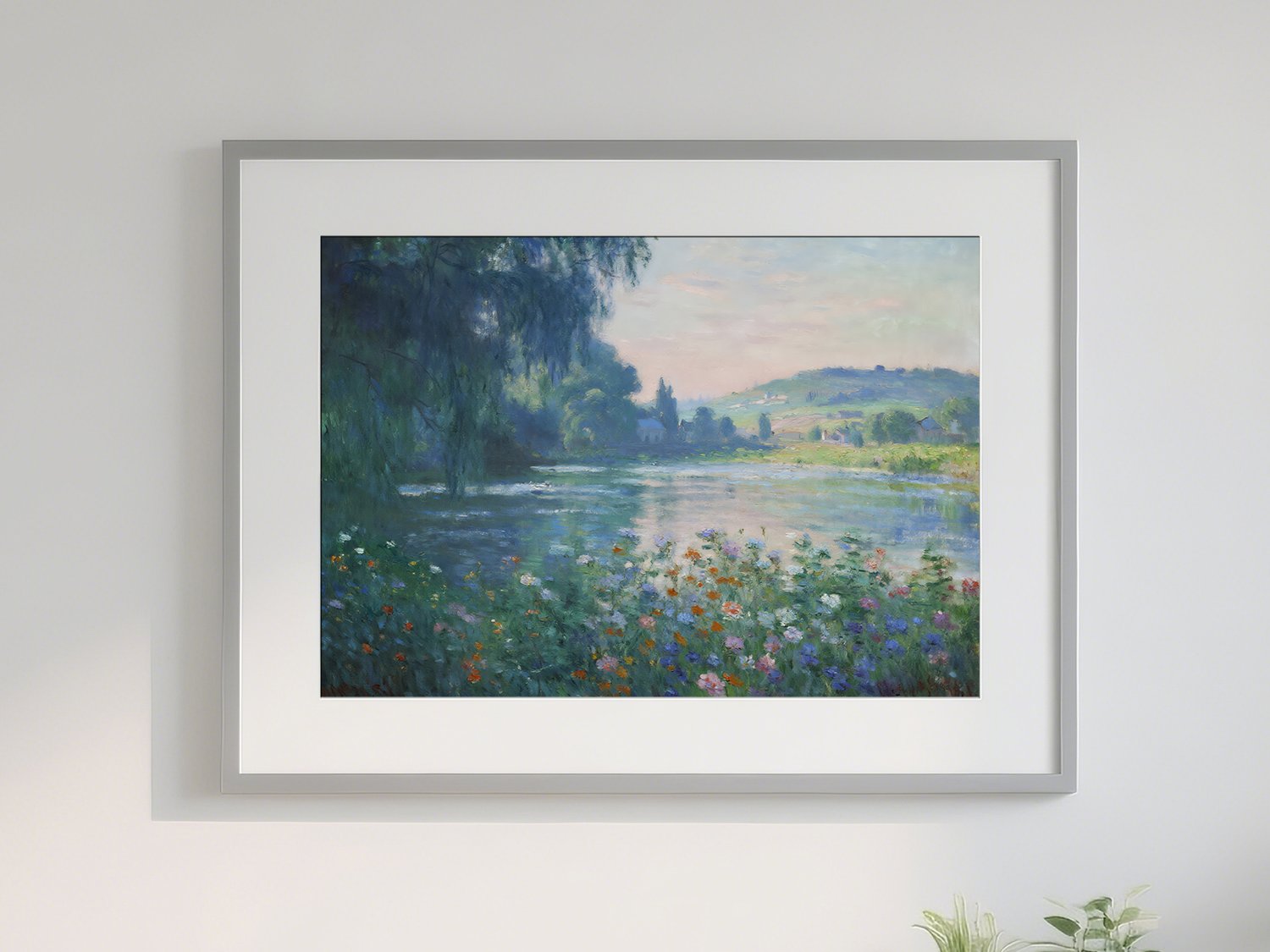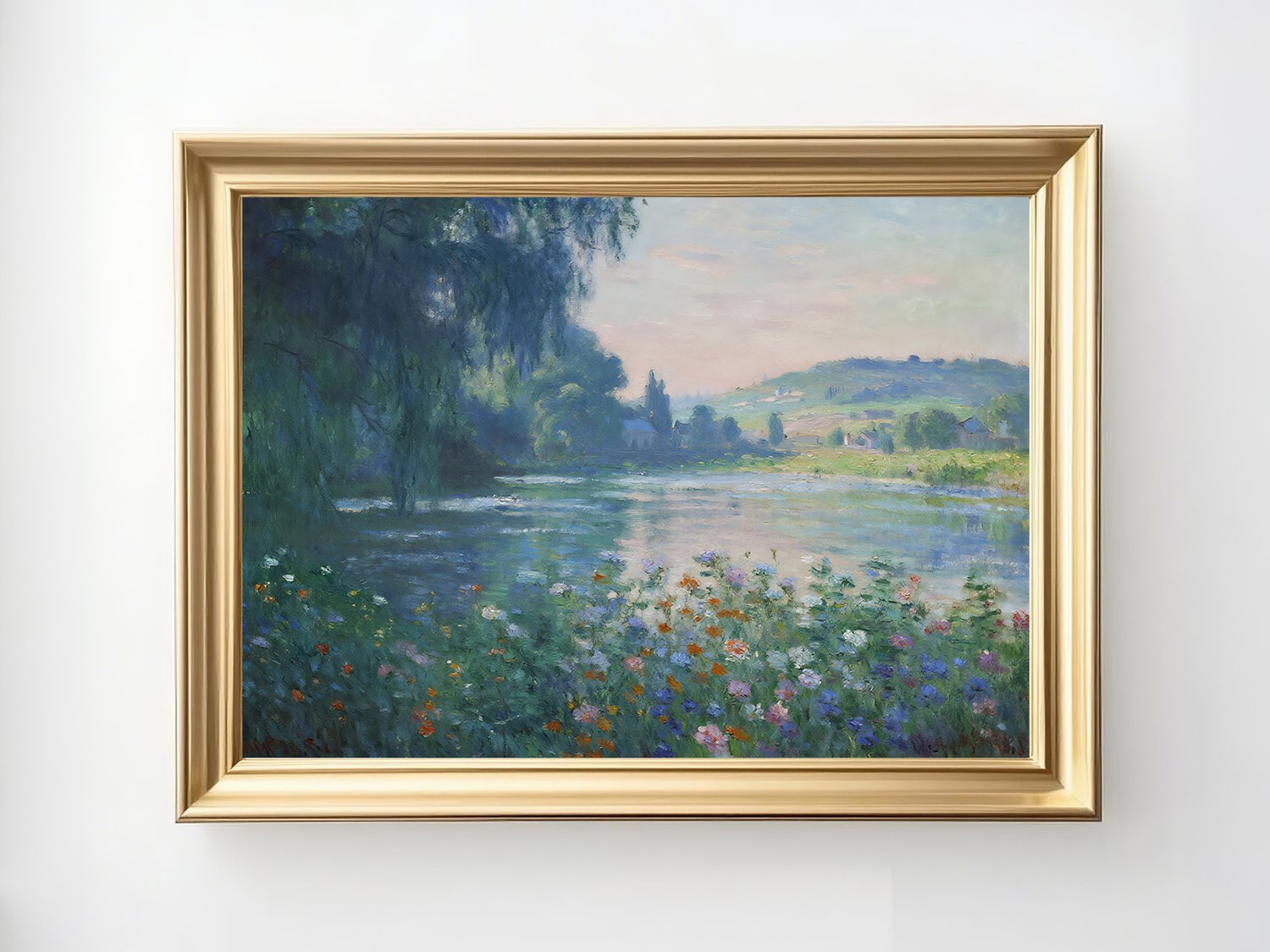 🛒A Monet-style impressionist artwork showing a tranquil river and vibrant wildflowers. In Feng Shui, water symbolizes wealth and flowers represent relationships and prosperity. Ideal for living rooms or entryways to attract gentle energy and abundance into your space.