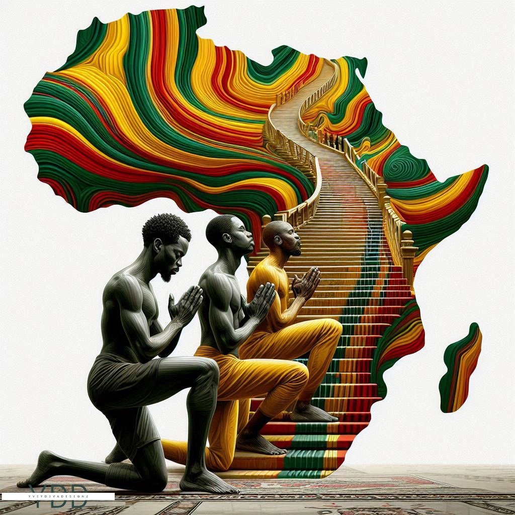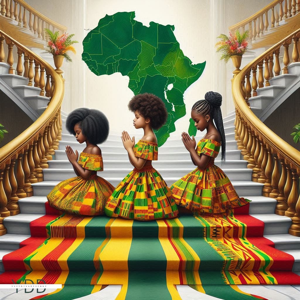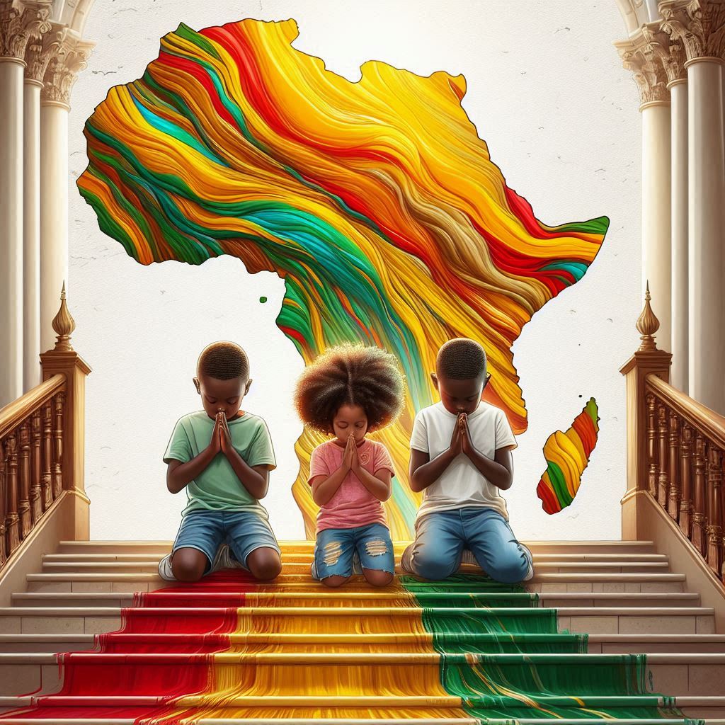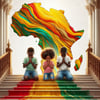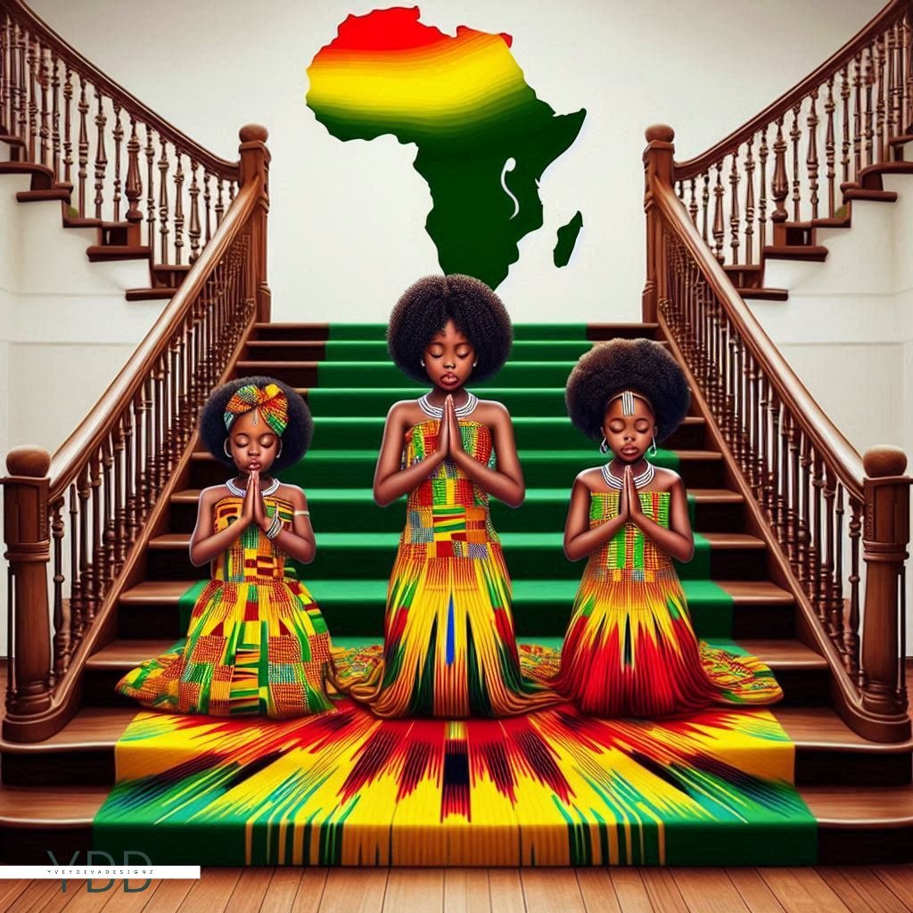 A powerful depiction of unity and faith, this artwork captures adults and children kneeling in prayer on an ascending staircase, each step adorned with the vibrant colors of Black History Month. At the summit, the map of Africa glows, symbolizing heritage, resilience, and the collective journey toward enlightenment and strength.