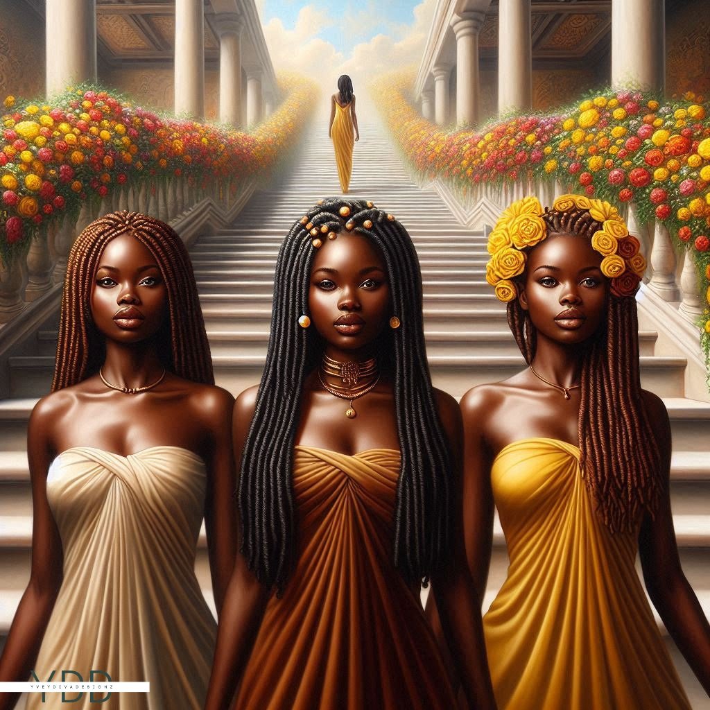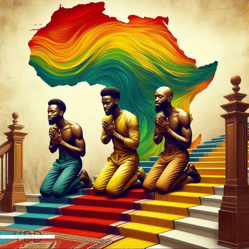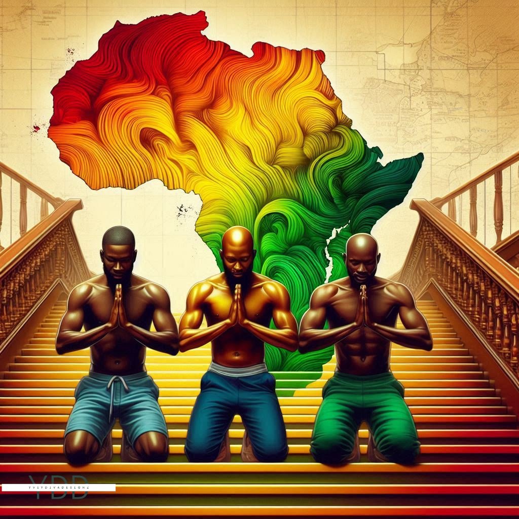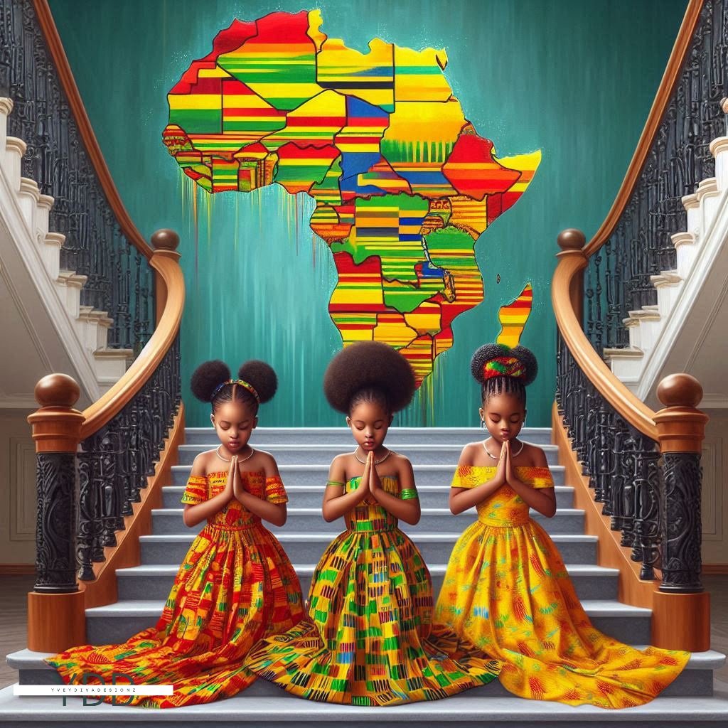 A powerful depiction of unity and faith, this artwork captures adults and children kneeling in prayer on an ascending staircase, each step adorned with the vibrant colors of Black History Month. At the summit, the map of Africa glows, symbolizing heritage, resilience, and the collective journey toward enlightenment and strength.