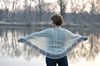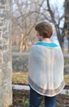Knitted mostly in stockinette stitch, the shawl has a simple cable panel down the center that flows into a cabled edge. Quiet Life is worked from the top down like a standard top down triangular shawl; however, the center cable panel changes the shape of the shawl to a rounded triangle/half-circle.