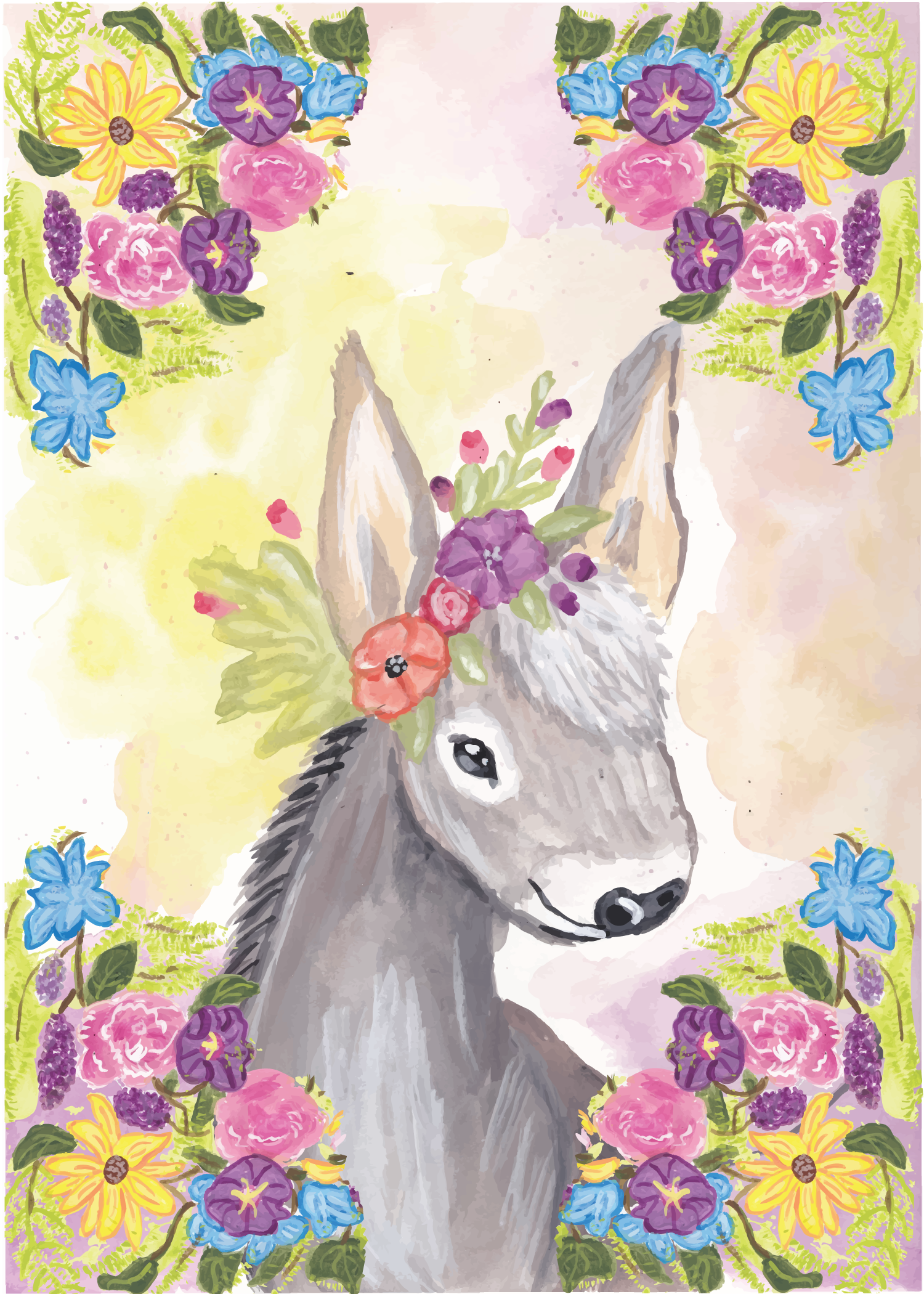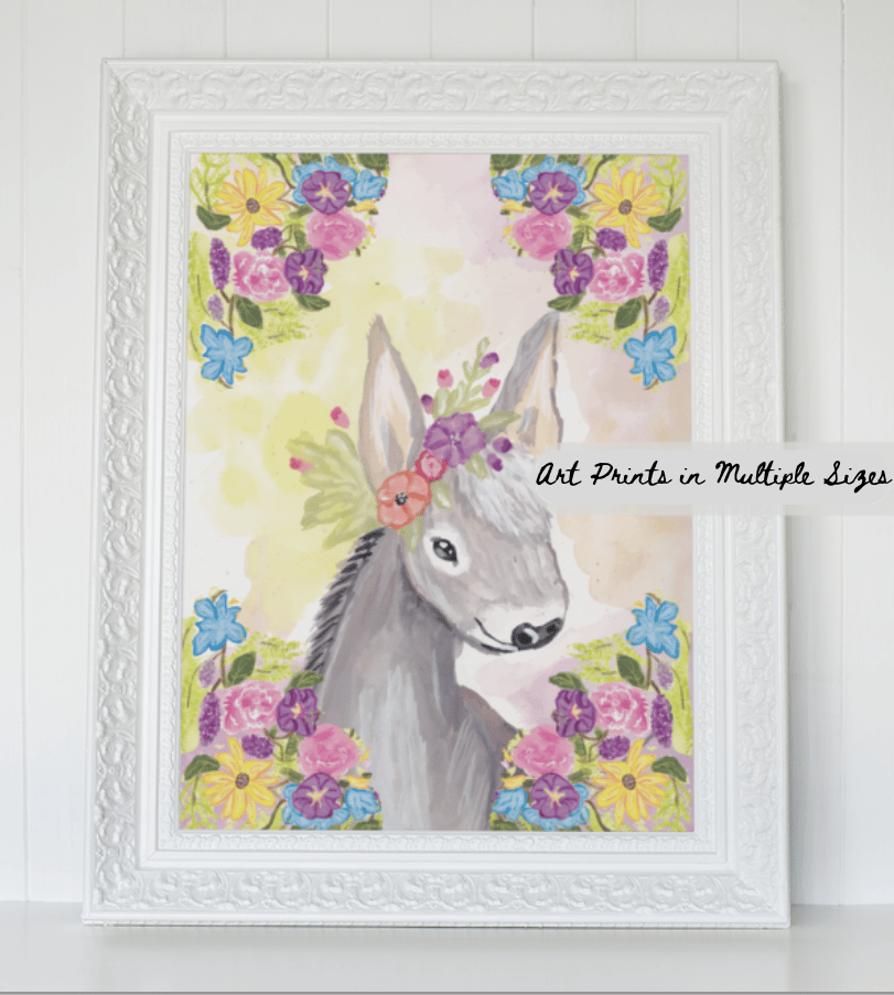 Baby donkey surrounded by flowers, in two sizes, and bundled with with other baby animals. Would look so sweet in baby's room! Print made from acrylic painting.