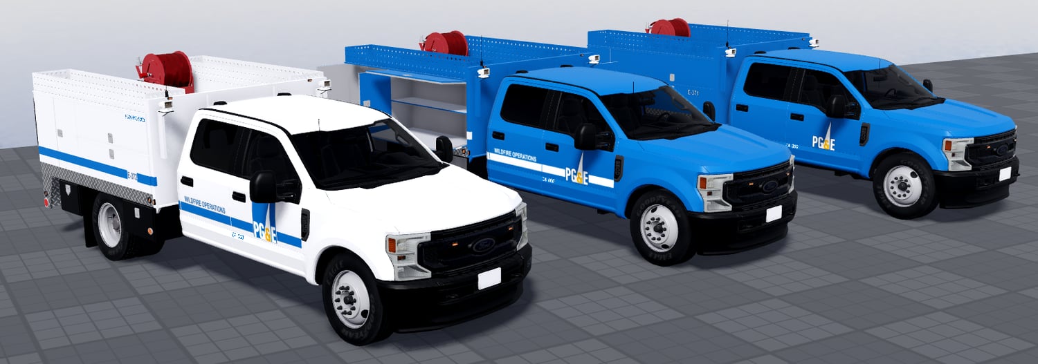 Based off of 3 vehicles from PG&E's Wildfire Operations. This pack comes with 3 different unique Liveries. All three liveries and ELS are 99% accurate to real life. This includes 3 stages of ELS and 3 stages of directionals. The vehicle also comes with A-chassis so it isn't static. The vehicle doesn't come with any sirens so you will have to add your own. Each vehicle comes with two variants, one has opening compartments while the other doesn't.
