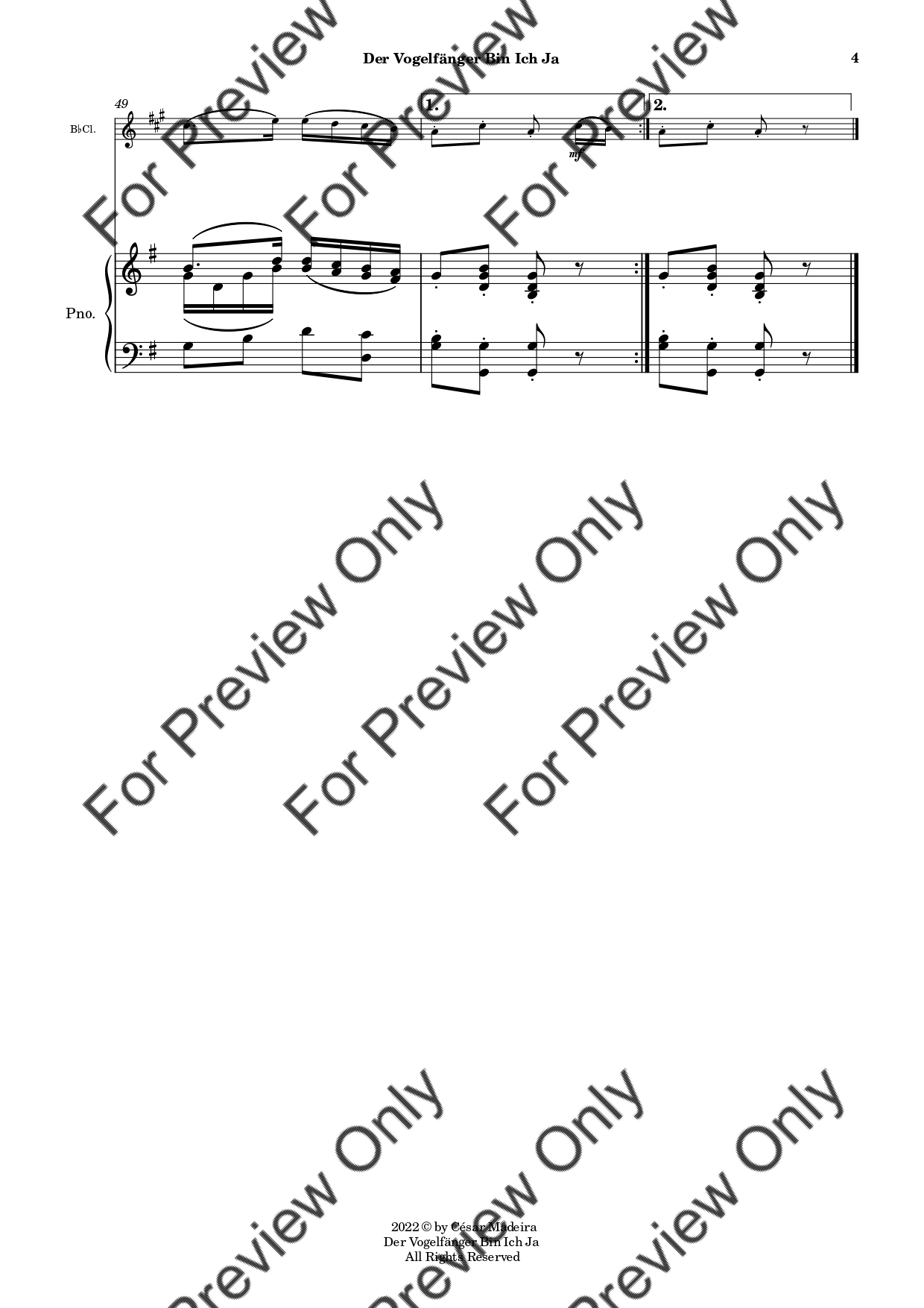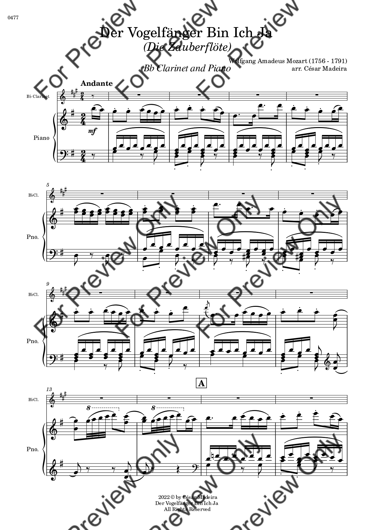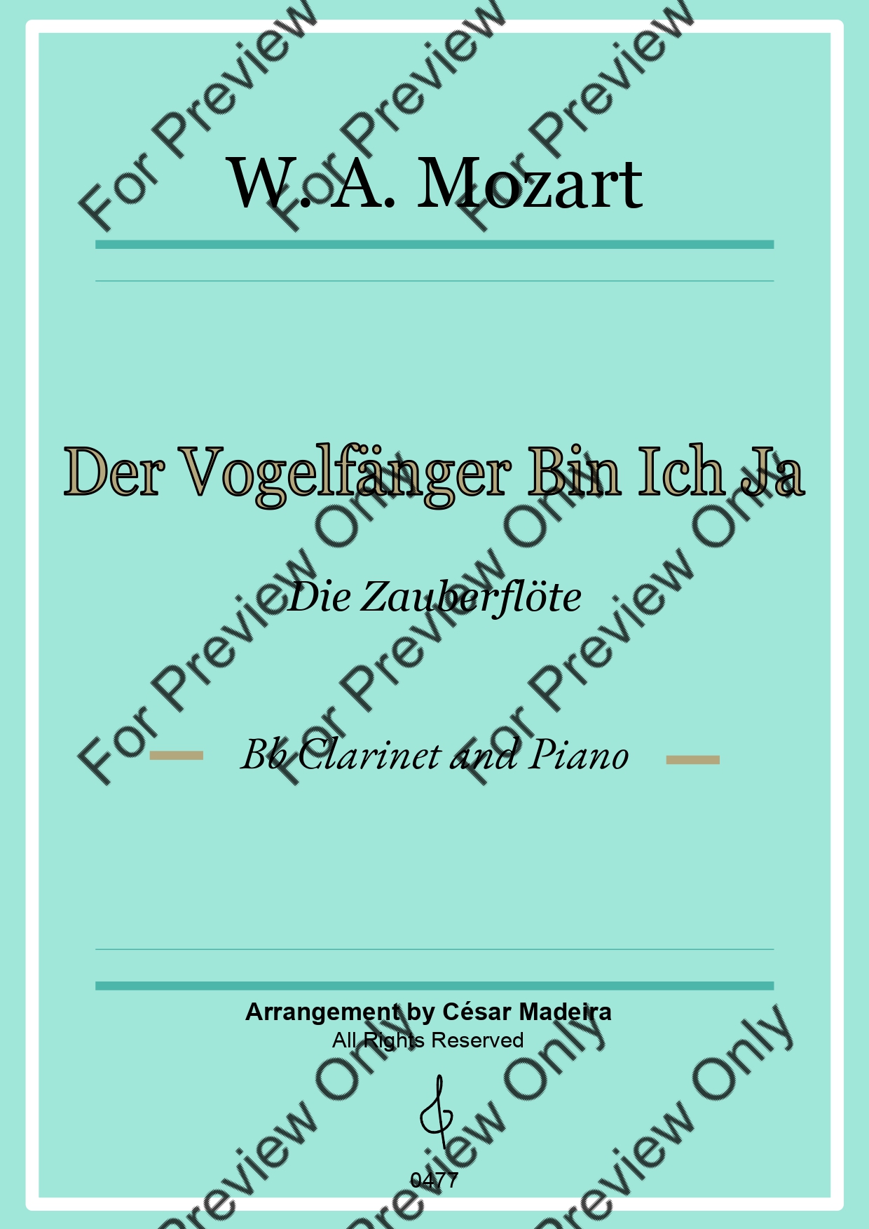 Der Vogelfänger Bin Ich Ja from Die Zauberflote (The Magic Flute) by Wolfgang Amadeus Mozart. Arrangement for Bb Clarinet and Piano. With Full Score and Individual Parts. Have fun!
