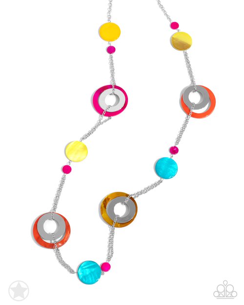 Infused along a double-layered, elongated silver chain, chunky brightly-colored shell discs with light-reflecting finishes join layers of metallic silver rings beside solitaire pink, blue, and yellow shells in varying sizes to create a retro-inspired display. Features an adjustable clasp closure.