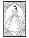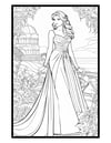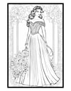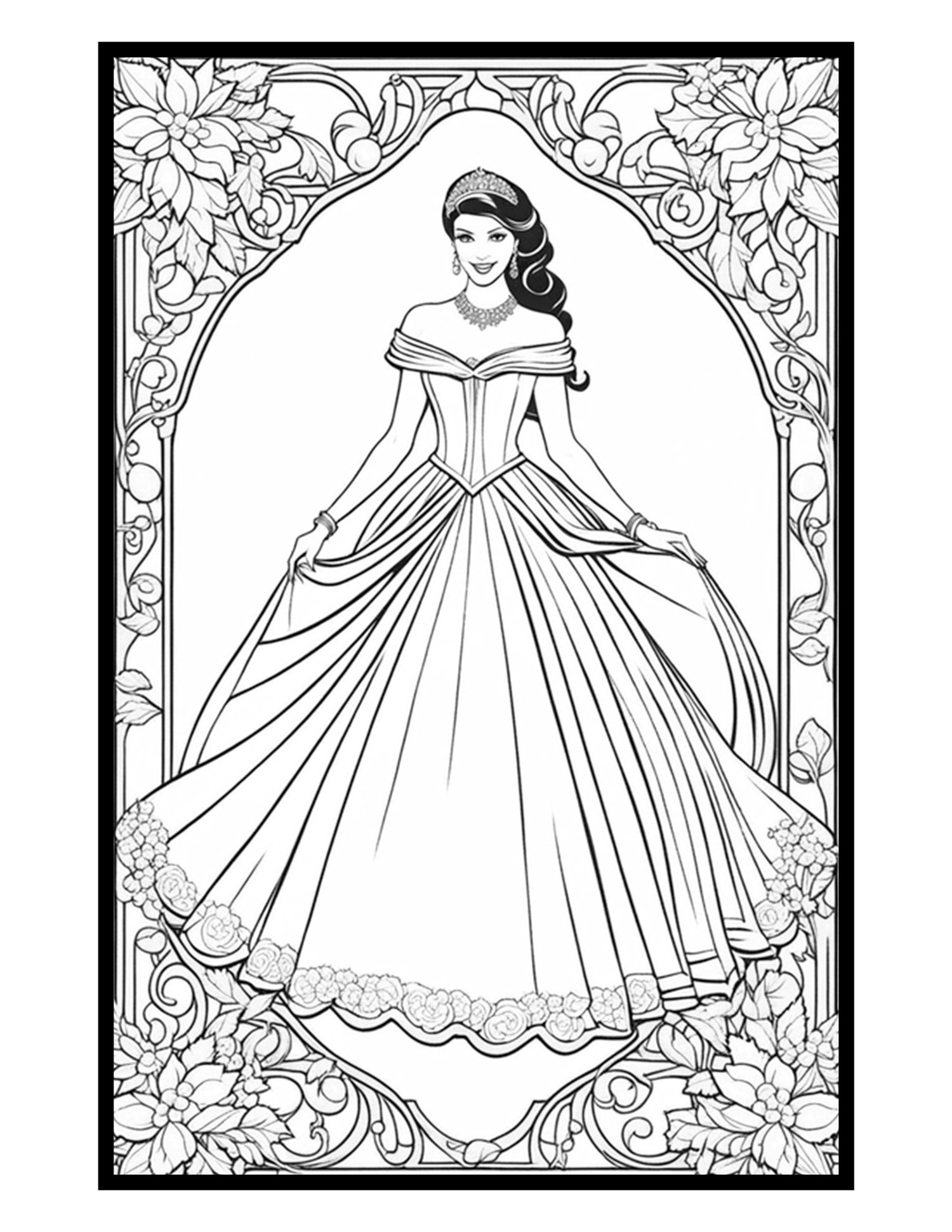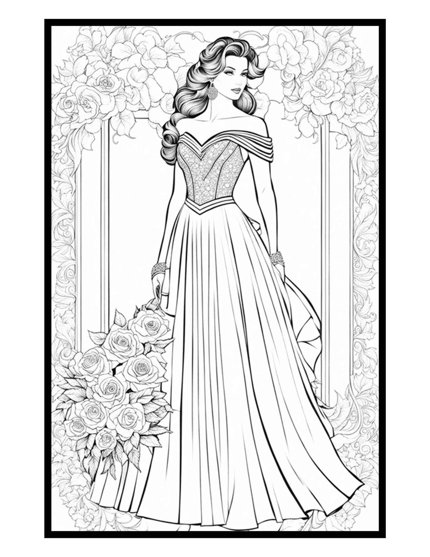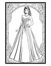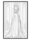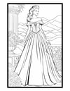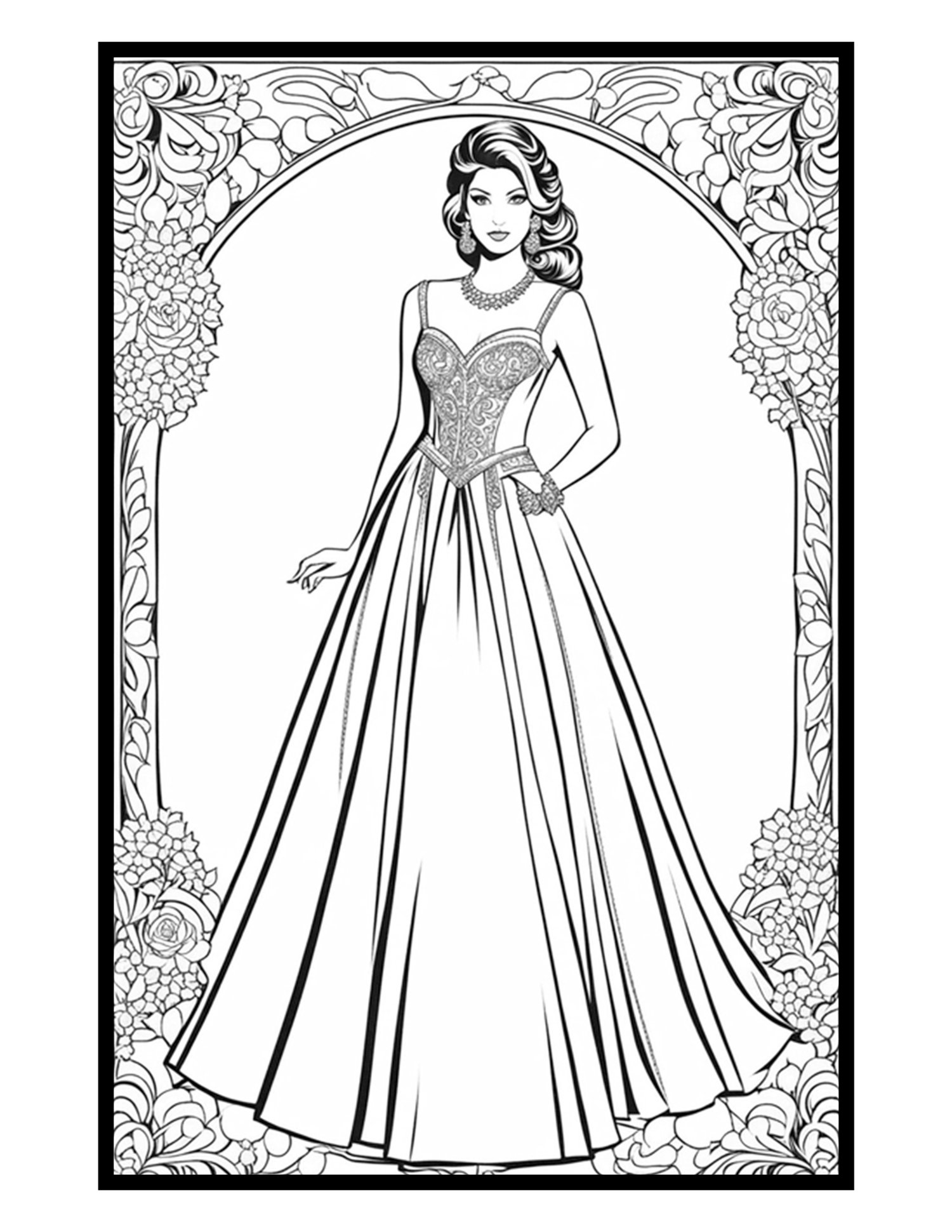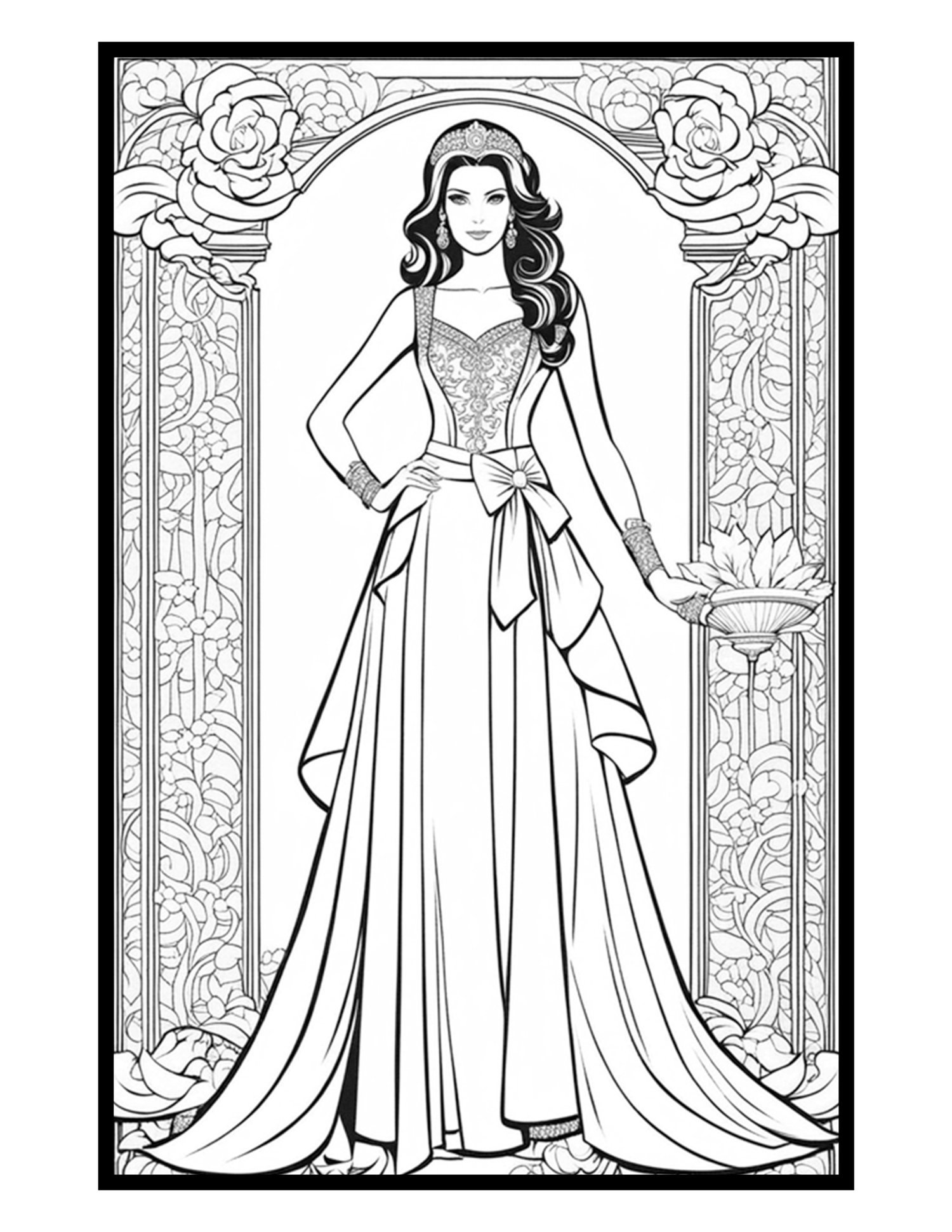 - Velvet Gown with Gold Embroidery – Intricate textures and regal patterns to color