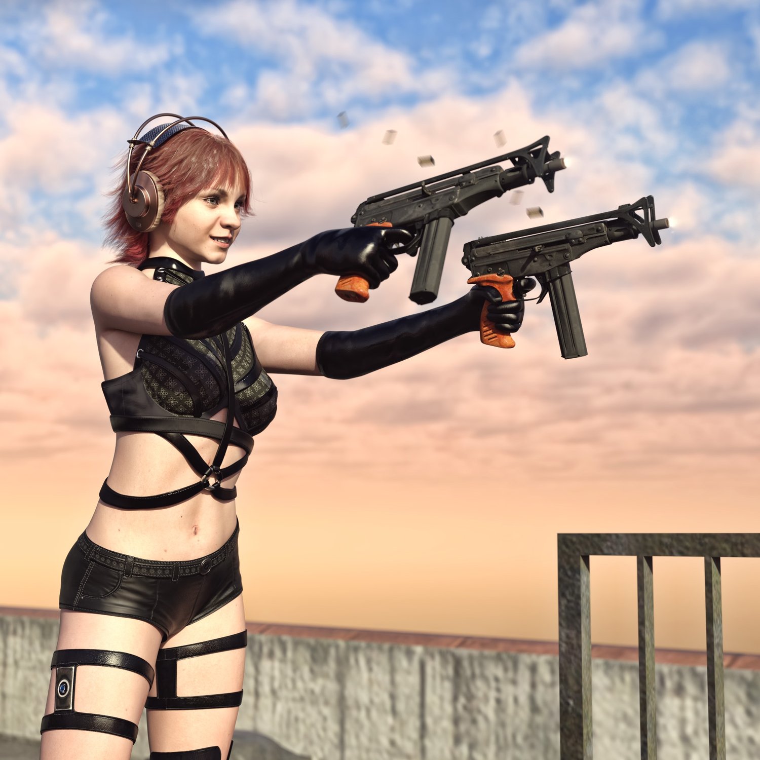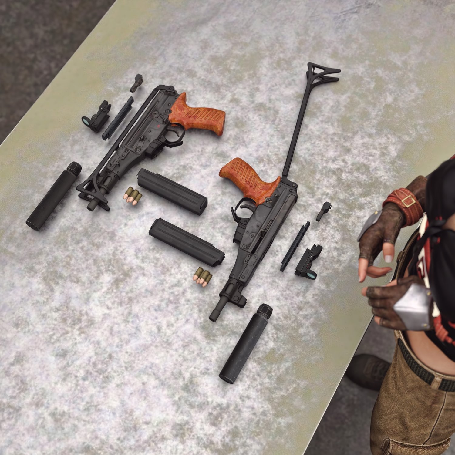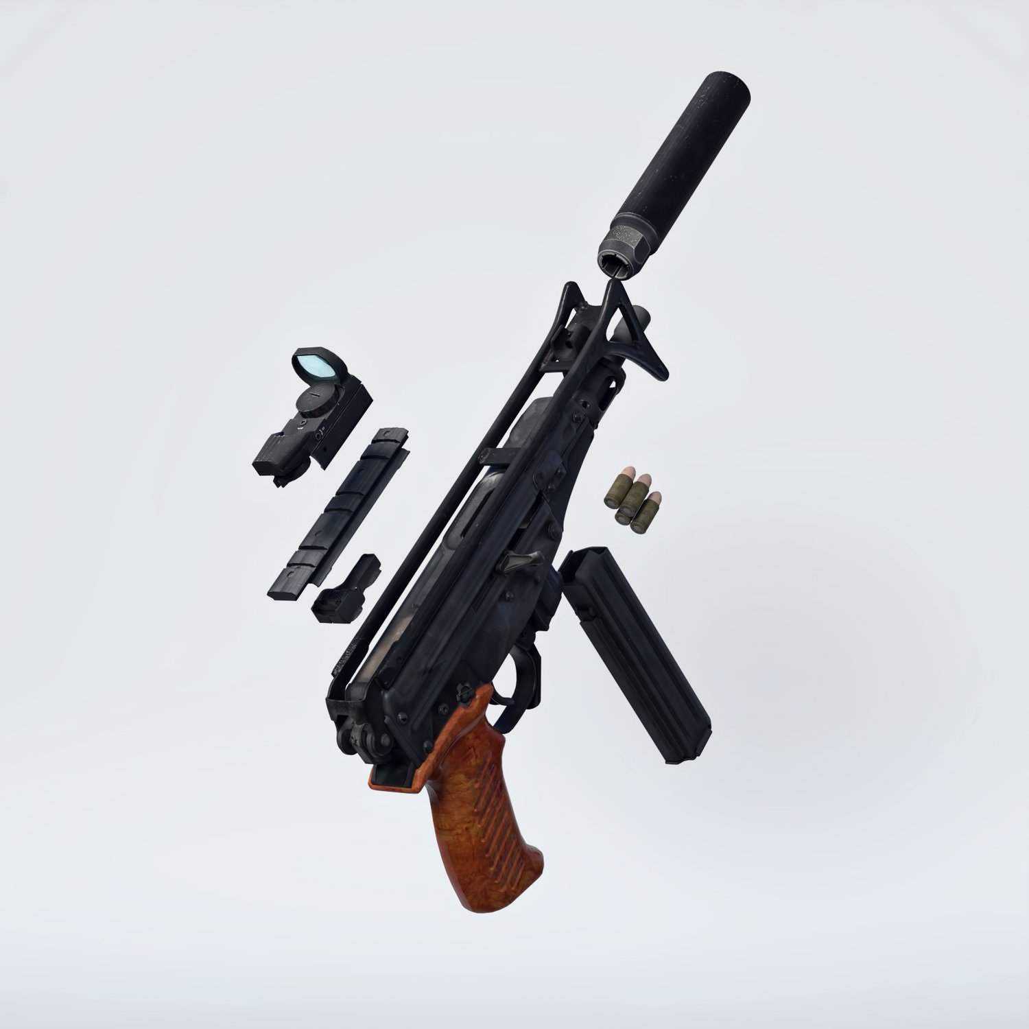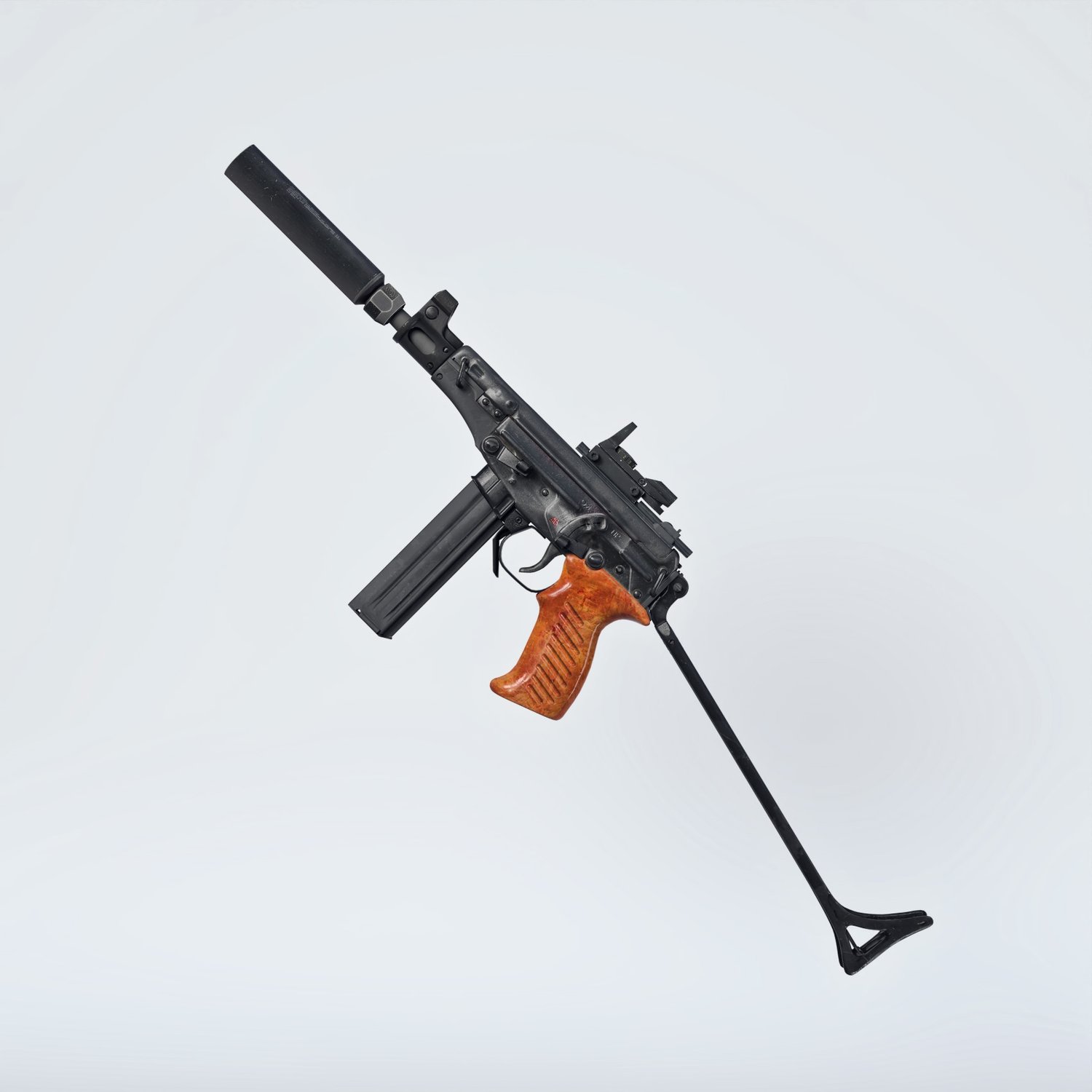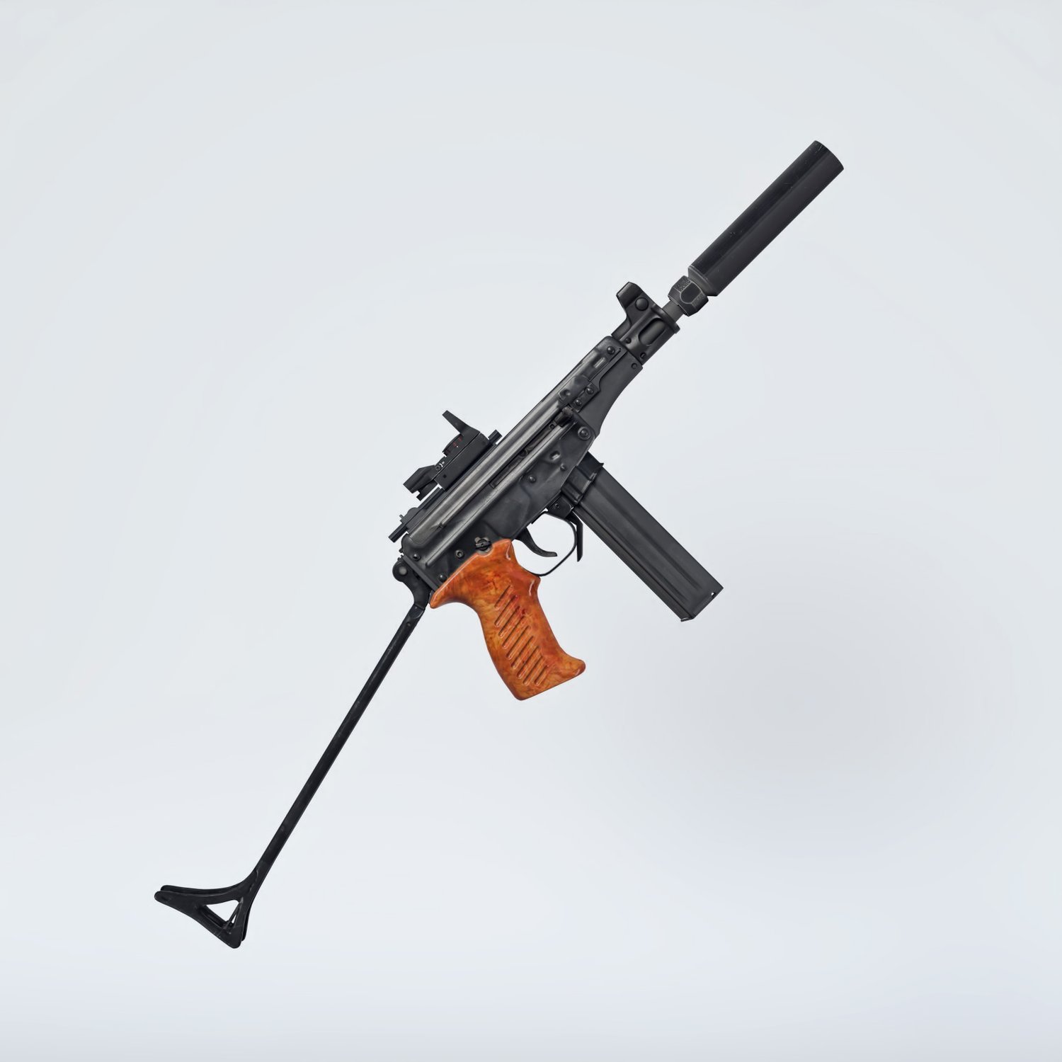 Probably a child of a marriage between OTS 02 Kiparis and Skorpion :) A cool looking submachine gun. The prop is rigged and converted for use with DAZ. Trigger, charging handle, bolt, silencer, etc also rigged for more realistic pictures. Includes a silencer, a red dot and rigged iron sight. The stock is also folding or can be hidden if needed.