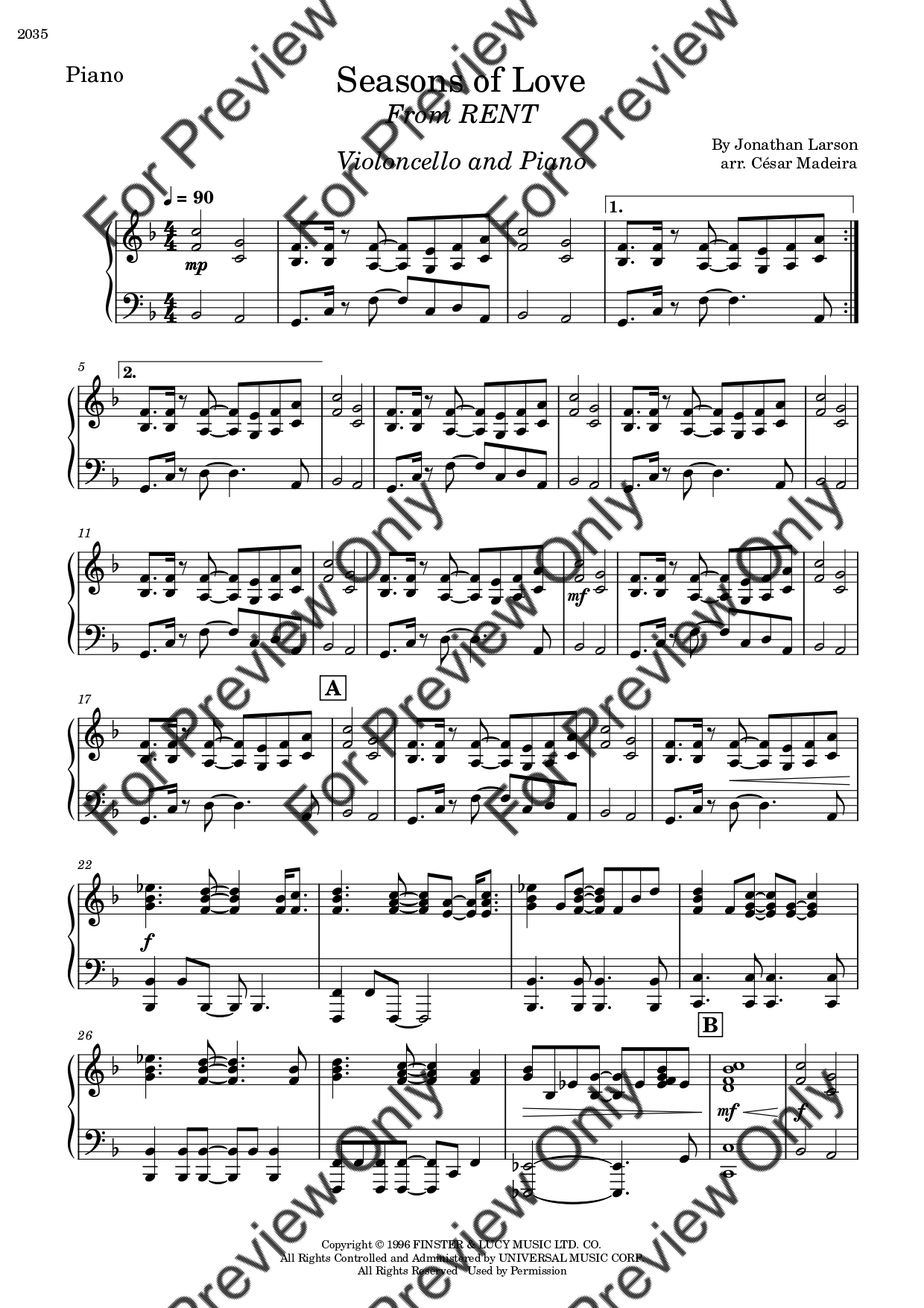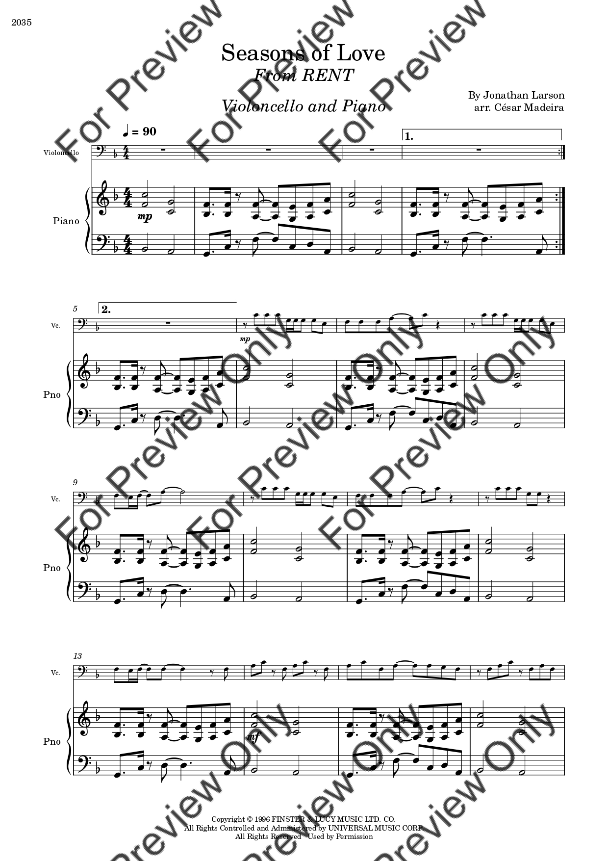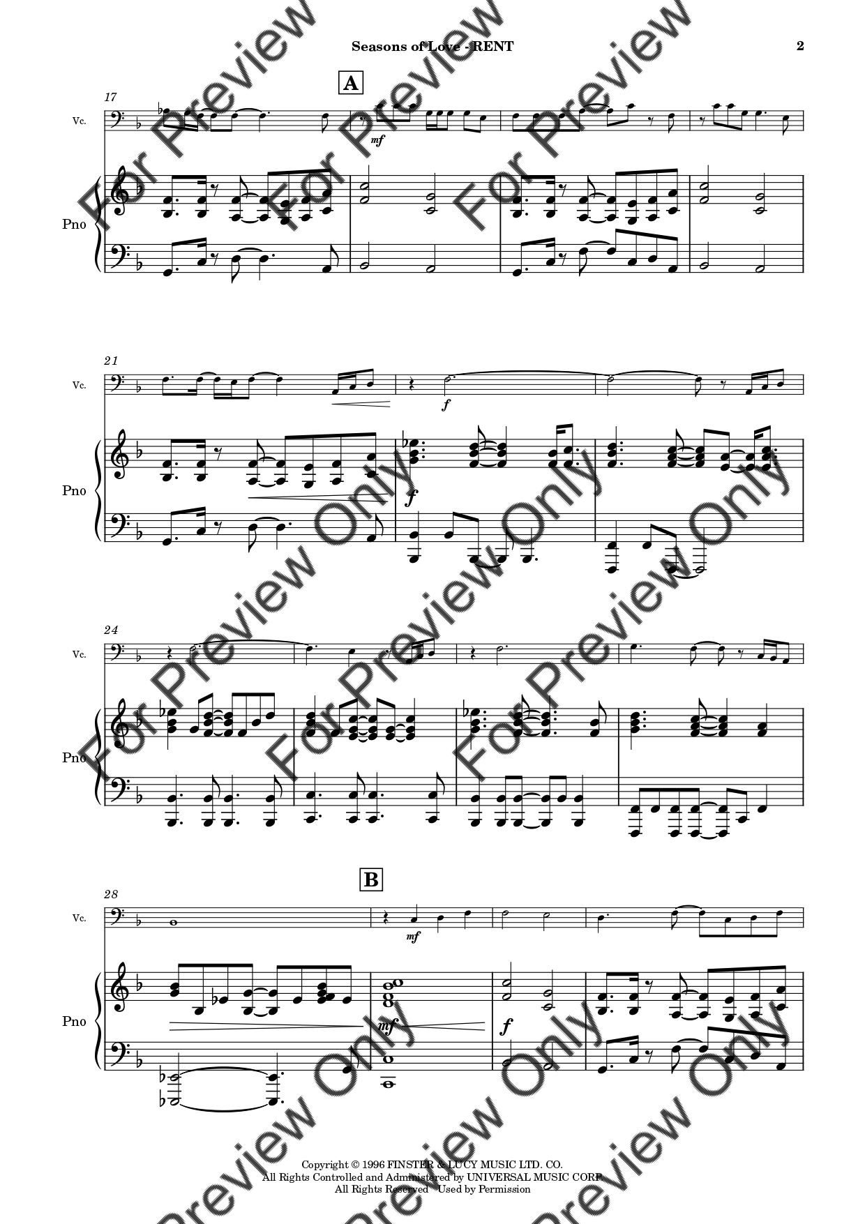 Seasons Of Love from RENT by Jonathan Larson. Arrangement for Violoncello and Piano. With Full Score and Individual Parts. Have fun!