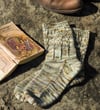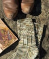 The Pern Socks are a top down heel flap sock with a twisted rib cuff and a twisted cable motif on a reverse stockinette background. The heel, bottom of the foot and toe are knit in stockinette. This pattern is suitable for tonals, speckled, and low and mid contrast variegated yarns.