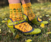 Anne McCaffrey's Pern books were the first “grown-up” novels I read. In Grade 5 the librarian showed us a variety of novels that might pique the interest of kids in our age bracket. She included Dragonsong set on the world of Pern. Our librarian was perhaps more clever than I gave credit for her at the time, she said the book was likely above our reading level but she was going to mention it anyways, of course that was a huge incentive for me to read the book. The cover showed a young woman surrounded by tiny dragons known as fire lizards. I was entranced. These socks are inspired by the deadly rain of Thread (an organism that rains down on the surface from an errant planet that swings near Pern in a predictable pattern), and the fire produced by Dragons from chewing a phosphine bearing rock. The cuff is the destructive Thread raining down, the cable motif is the Dragon flame that chars the destructive organism to ash.
