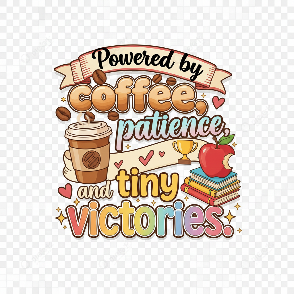 Every teacher knows the reality - teaching is powered by gallons of coffee, infinite patience with their students, and celebrating those small but mighty victories throughout the day. Whether it's a student finally understanding a concept, a quiet moment in a chaotic day, or simply making it to Friday - tiny victories matter! This design captures the heart of teaching perfectly.
