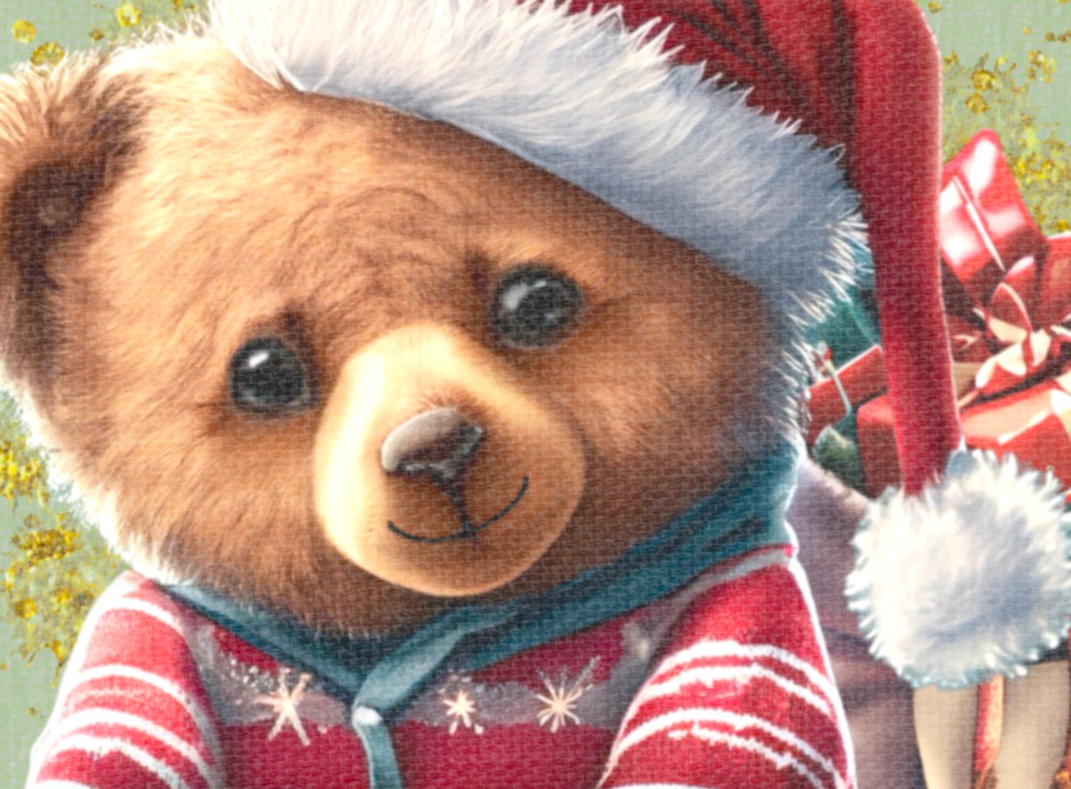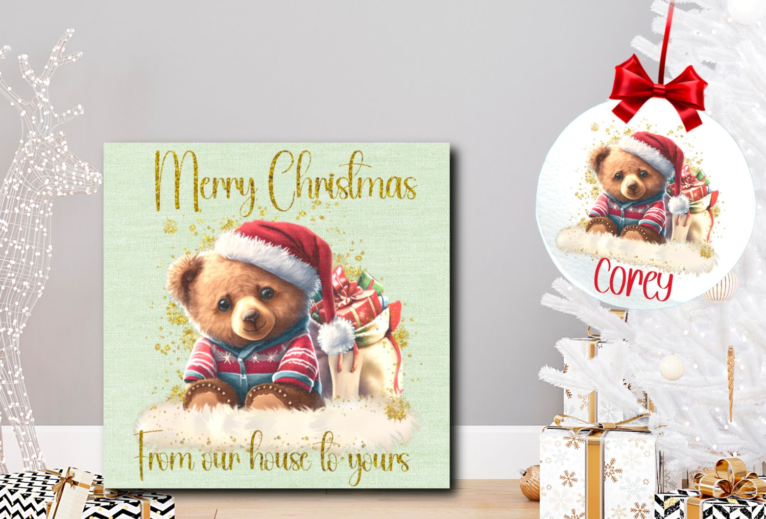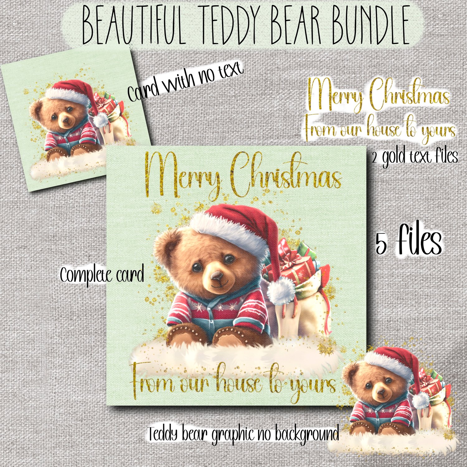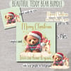 Christmas teddy bear bundle. Gorgeous, cuddly teddy with Christmas pj’s and Santa hat, sitting next to his bag full of gifts. This one has been designed with a canvas texture and gold splash embellishments.
