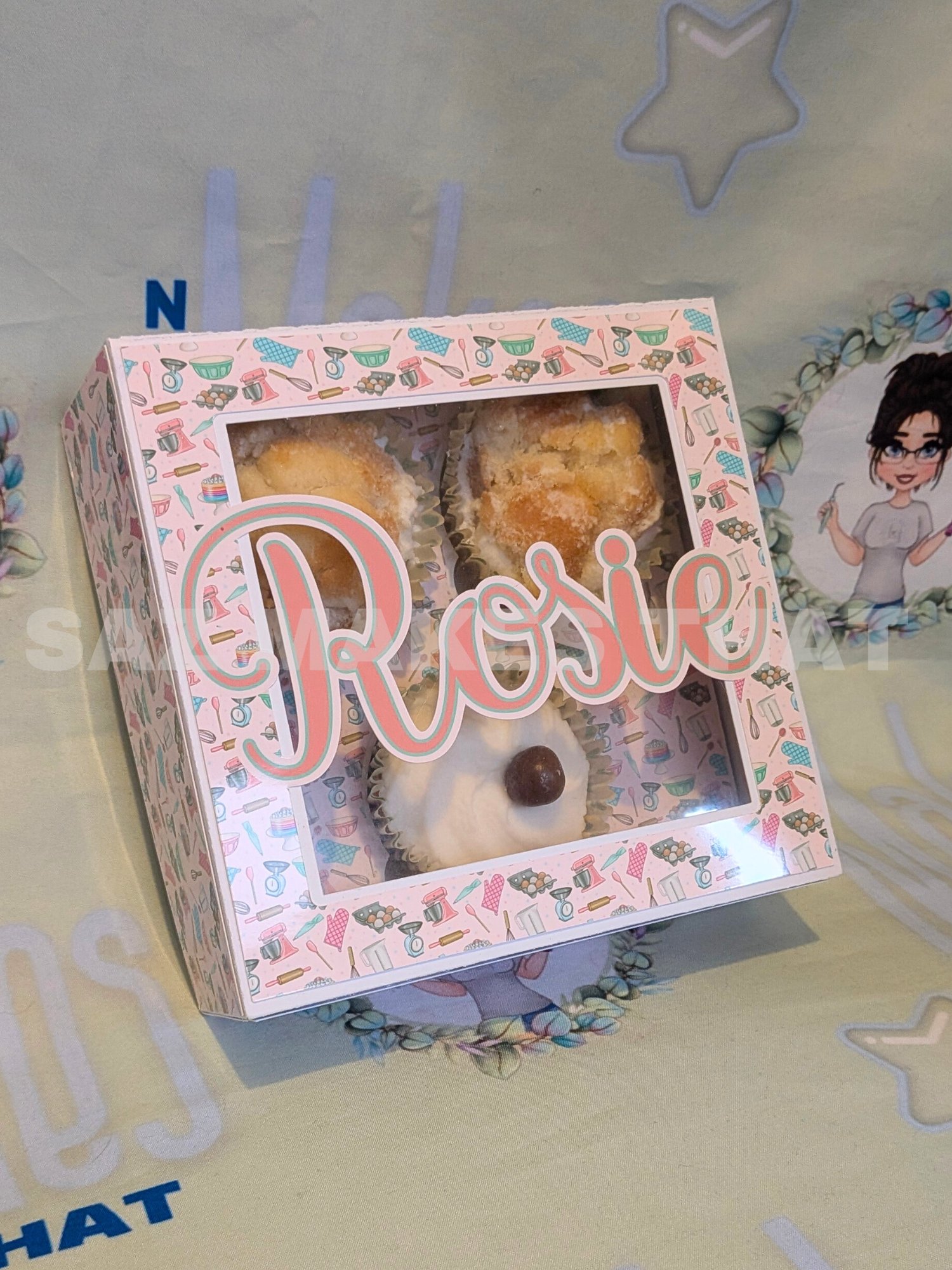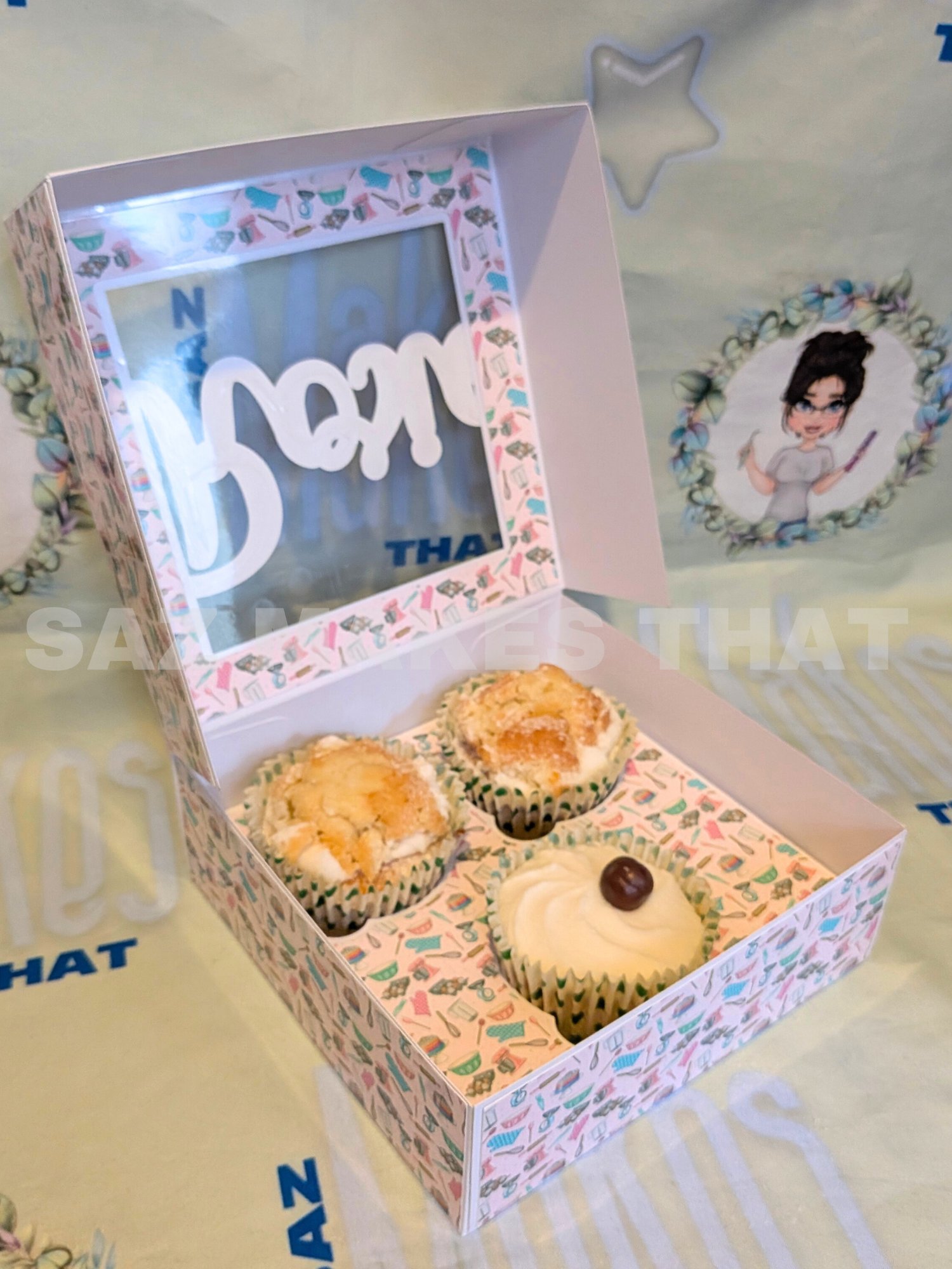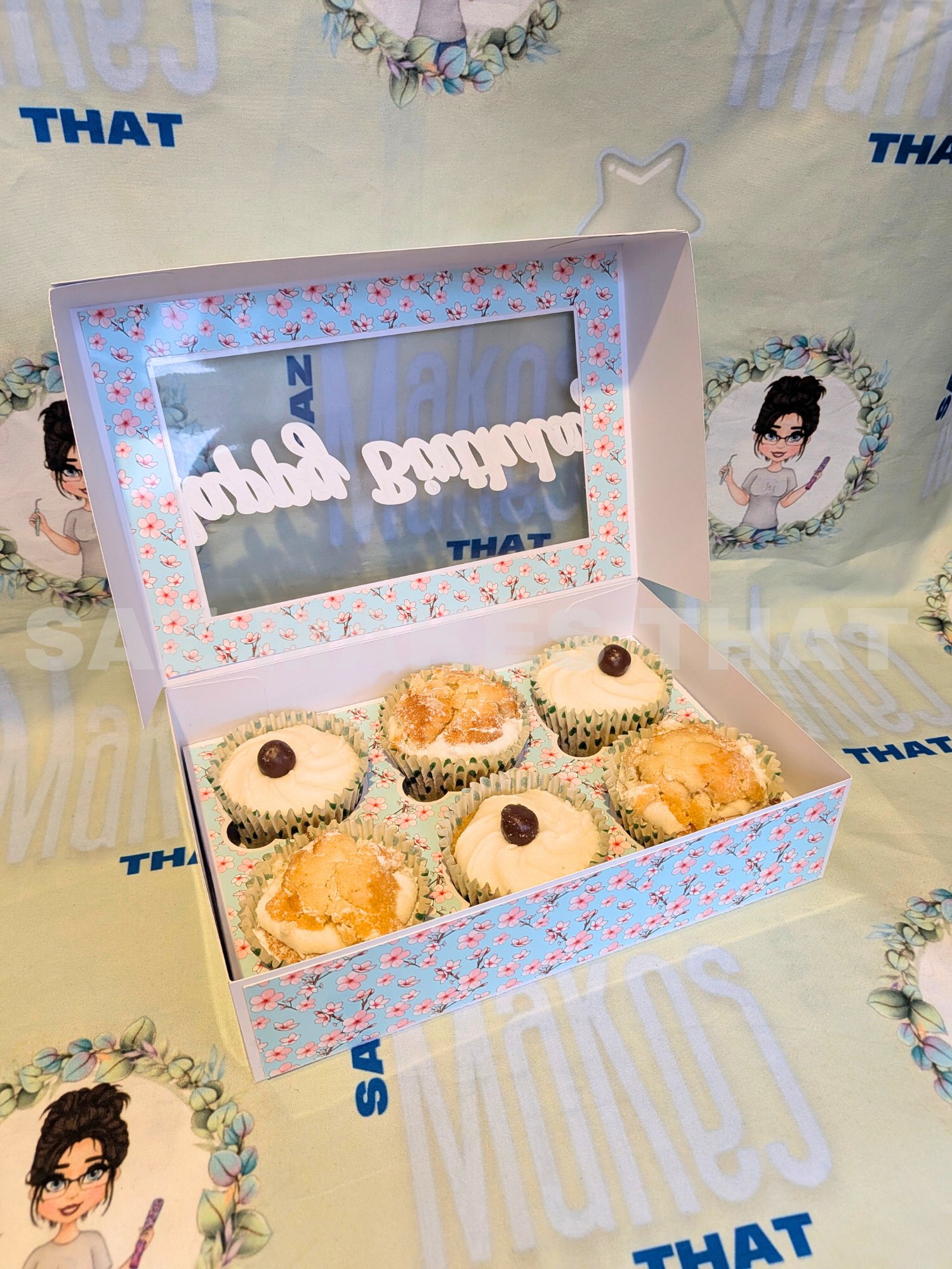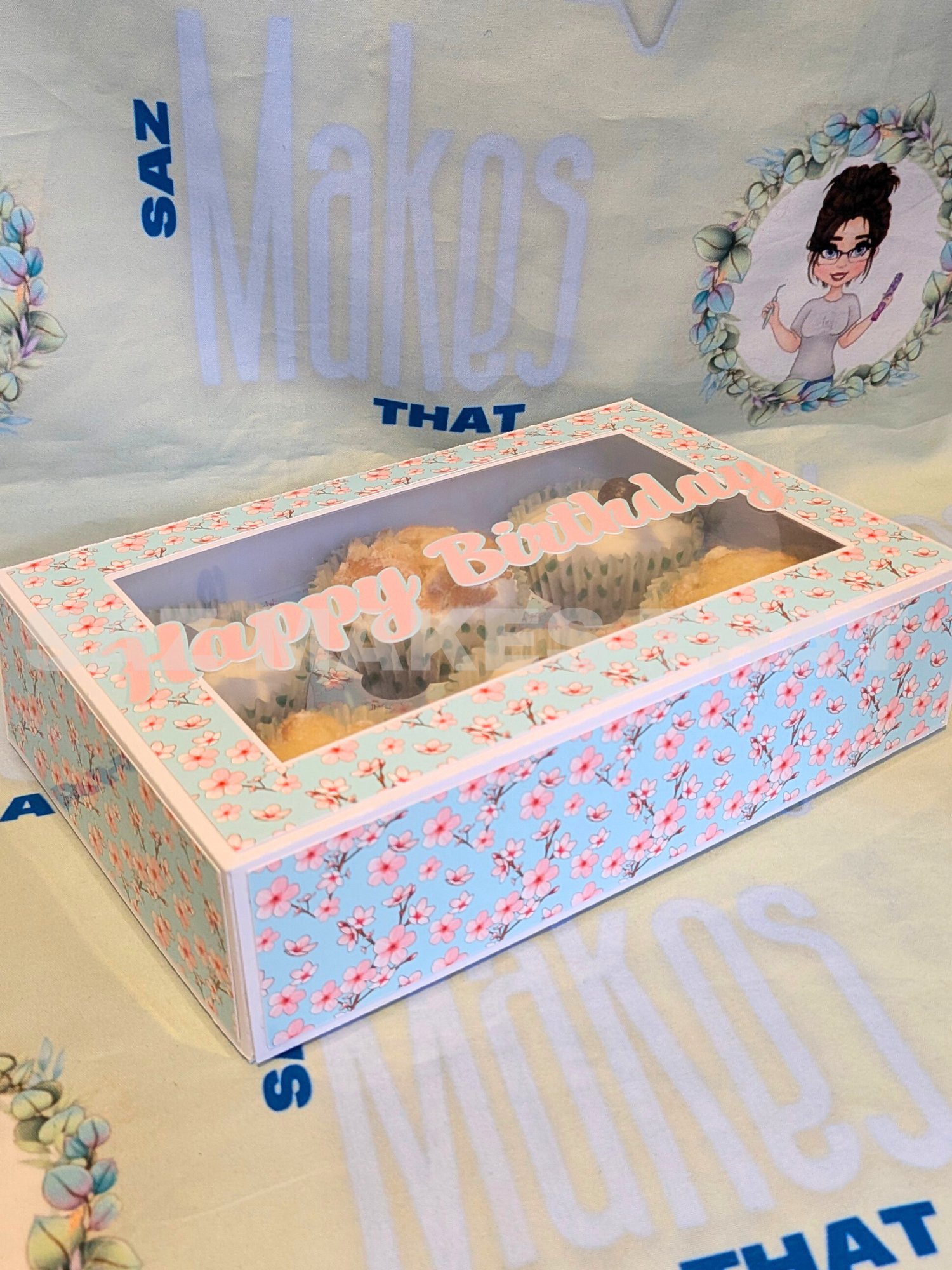 the file includes boxes for 1, 2, 3, 4, 5 & 6 cupcakes that can be personalise with images and text for print then cut or just cut from plain or patterned card.