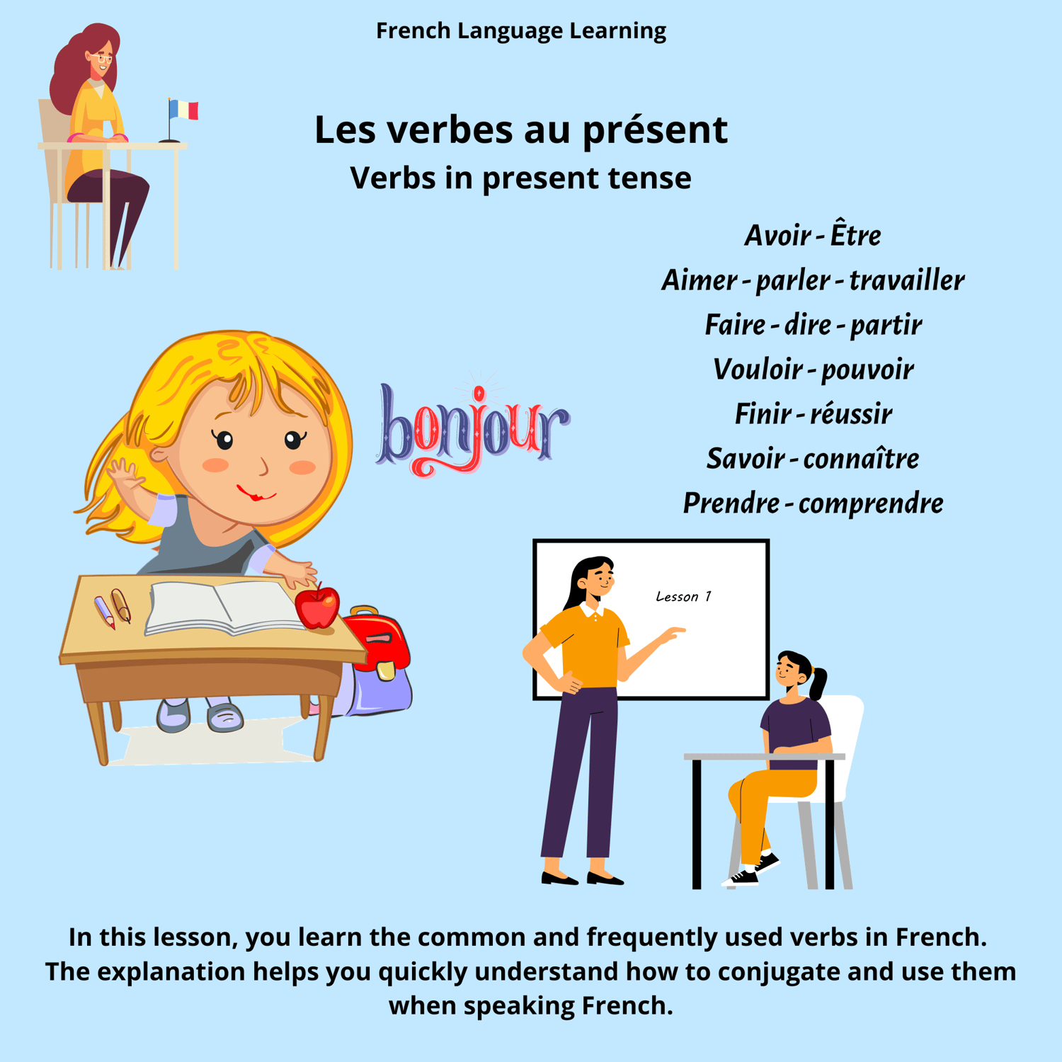 - Recap of the most frequent and used verbs in French.