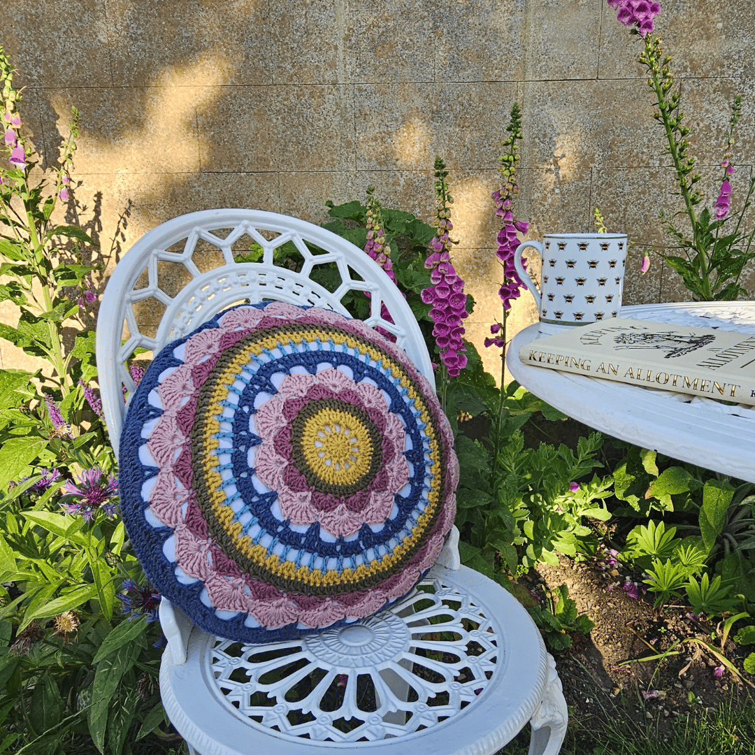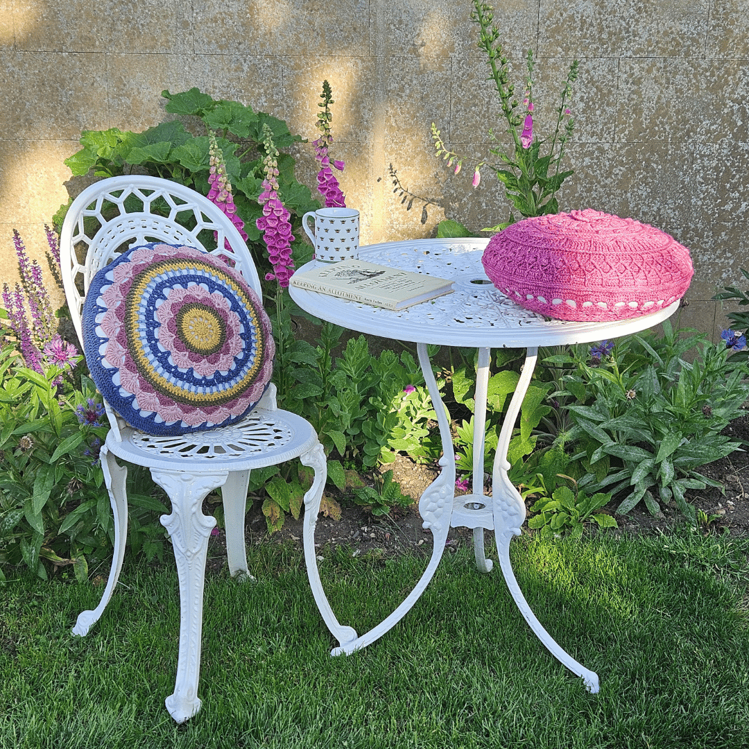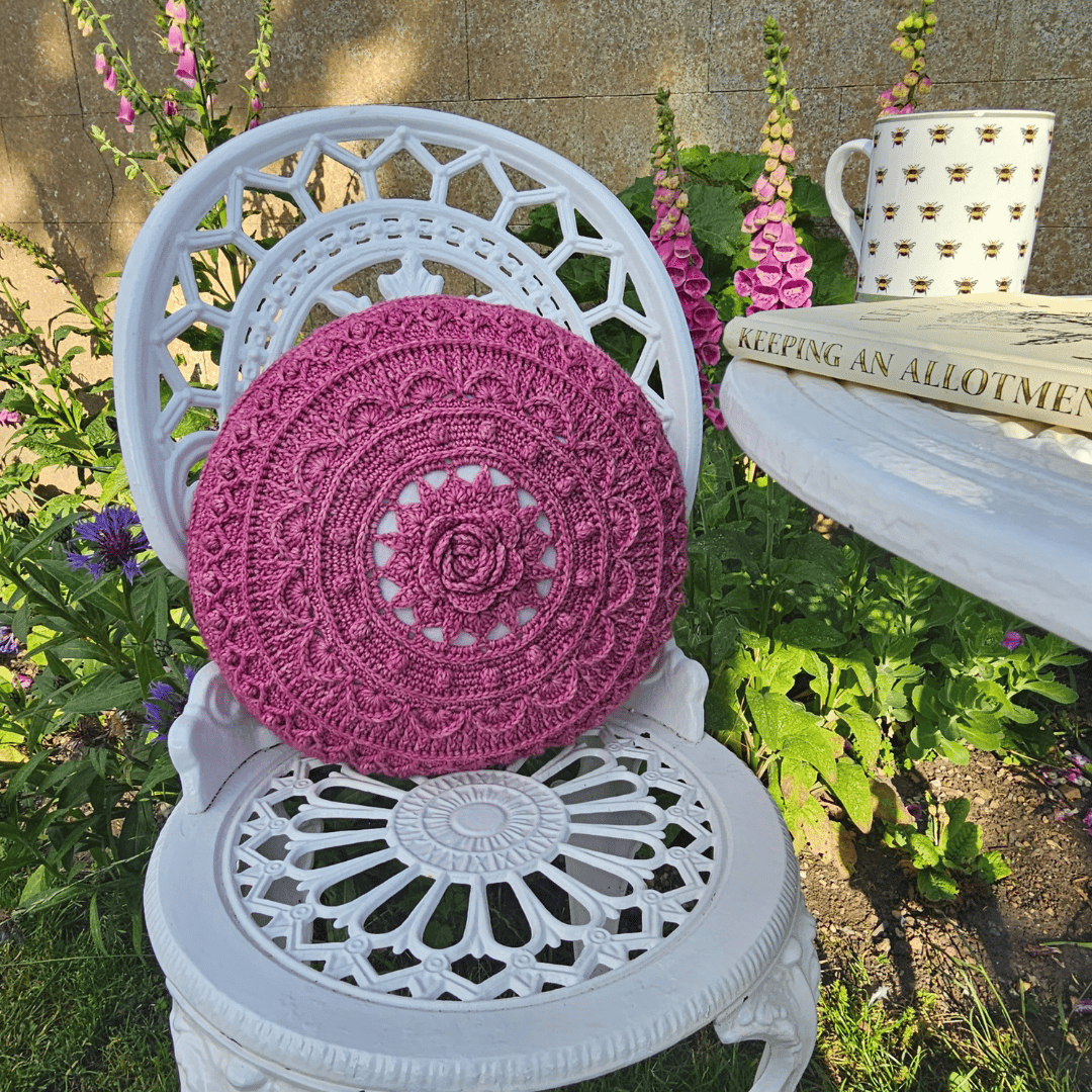 Add a touch of vintage charm to your cottagecore decor with my Quilted Rose crochet cushion cover pattern. Featuring a blooming rose in the centre, surrounded with a beautifully textured crochet background, it is a joy to crochet, use and display. The texture is inspired by vintage candlewick bedspreads and is created by using simple stitches in interesting ways. The back of the cushion is more open and lacy, with shells echoing those on the front panel.