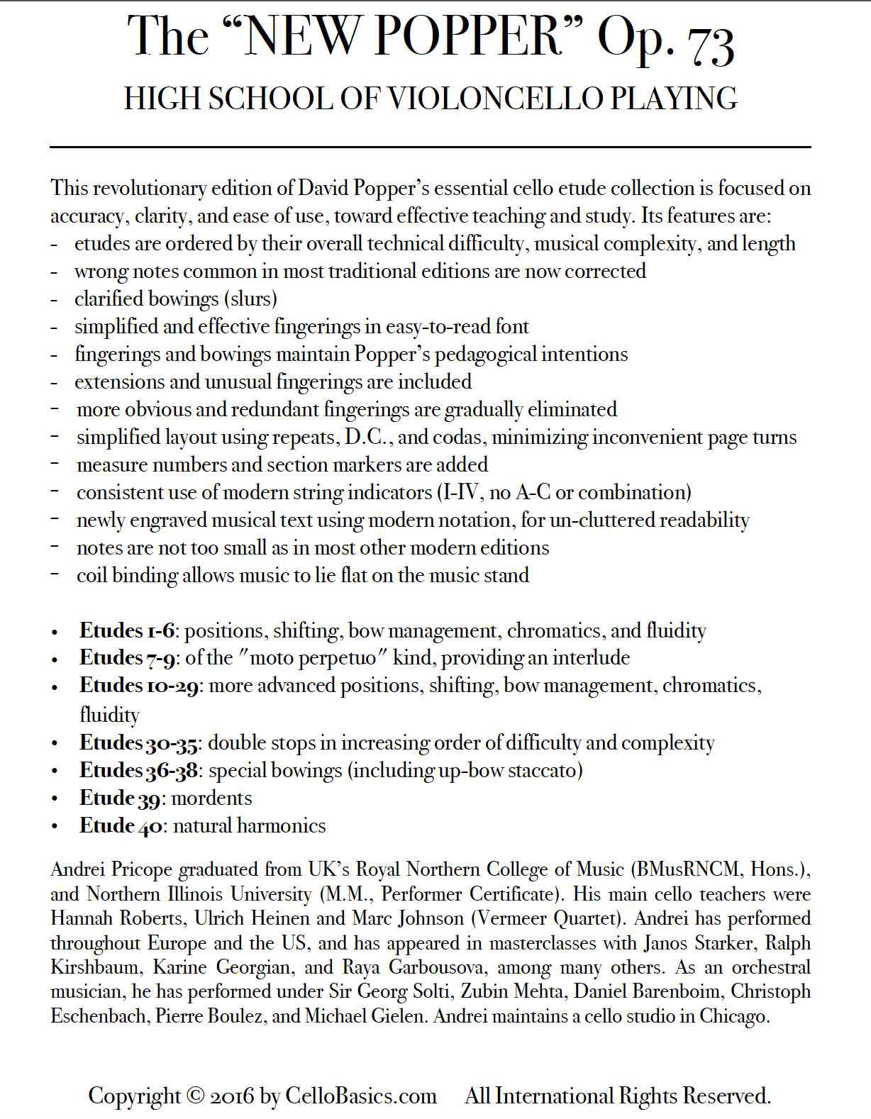 This revolutionary edition of the most important cello etude collection is focused on accuracy, clarity, ease of use, toward effective teaching and study, and features: