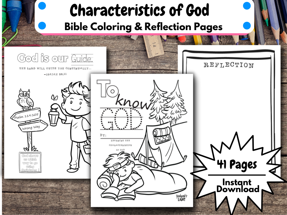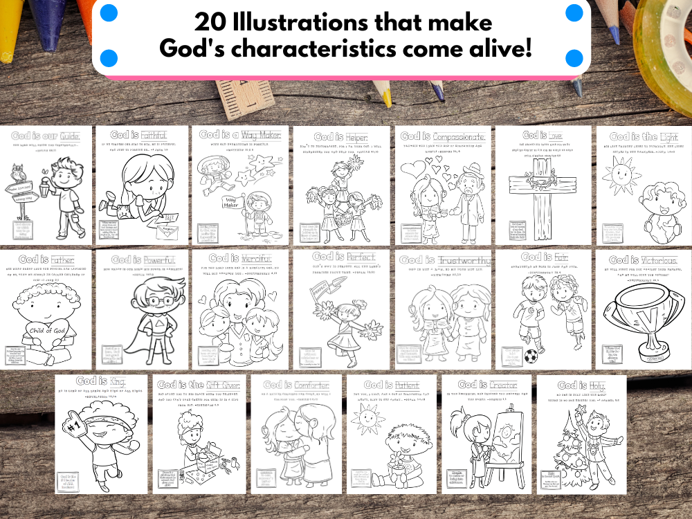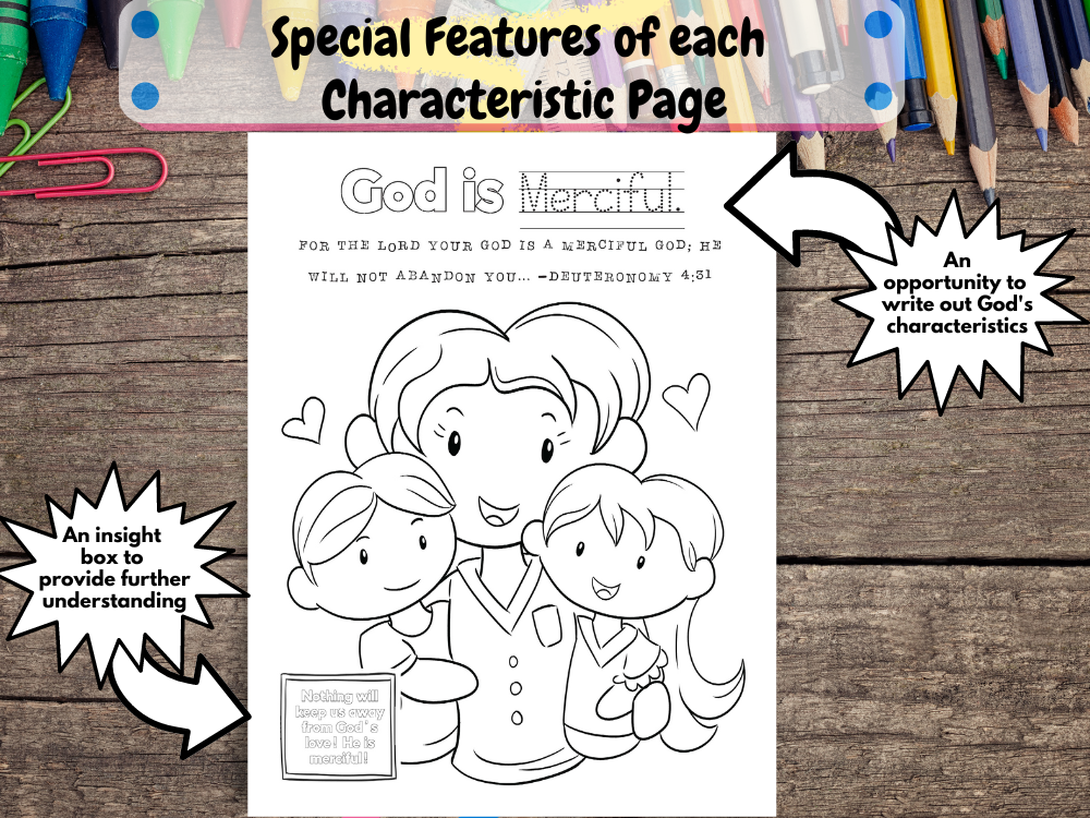 - Coloring Pages include characteristics of God with a corresponding memory verse and a reflection page for each characteristic.