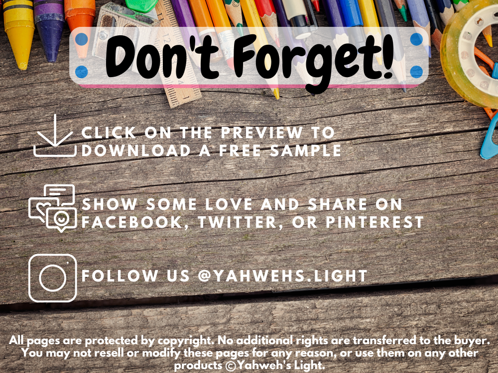 No additional rights are transferred to the buyer. You may not resell these images for any reason, or use them on any other products ©Yahweh’s Light