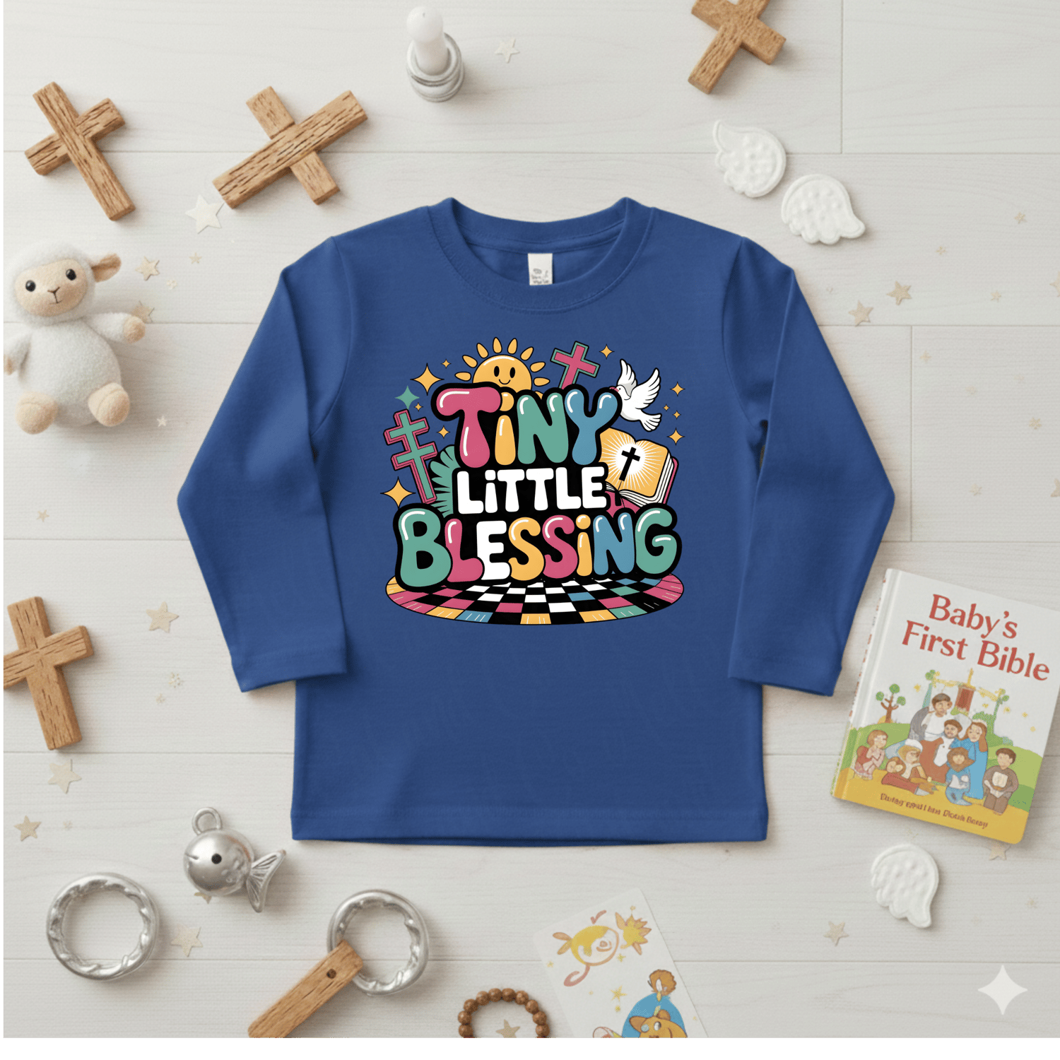Celebrate faith, joy, and new beginnings with this adorable Tiny Little Blessing digital design. Featuring cheerful, colorful lettering surrounded by meaningful Christian symbols—including crosses, a Bible, a dove, and warm sunshine—this design is perfect for honoring life’s most precious blessing.