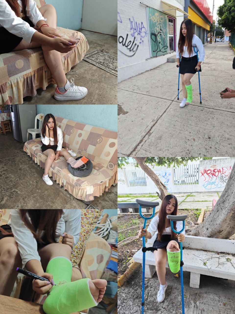 Ella esta tratando de cerrar una cortina, cuando cae del sillón y se dobla el tobillo, se le coloca una férula y después regresa a casa con un slc, después se queda dormida en el sillón leyendo un libro, posteriormente comienza a decorar su yeso, por ultimo camina con muletas.