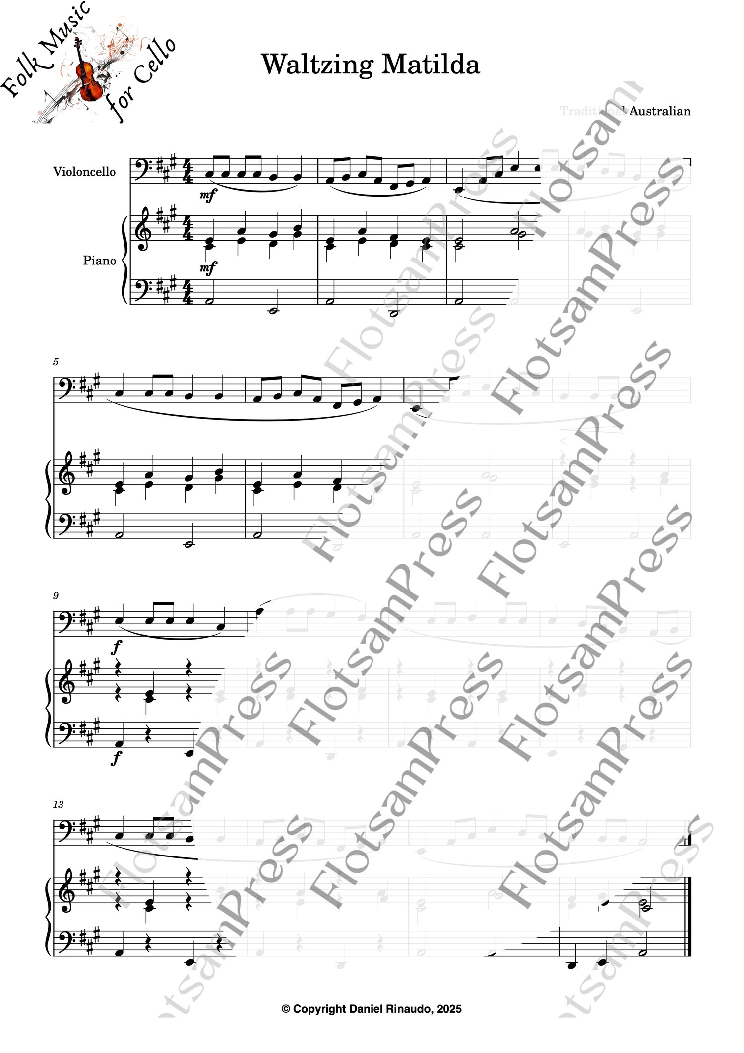 This arrangement of Walzing Matilda is written for beginner to lower-intermediate cello players, with a simple and supportive piano accompaniment. Perfect for church services, lessons, or home practice.