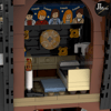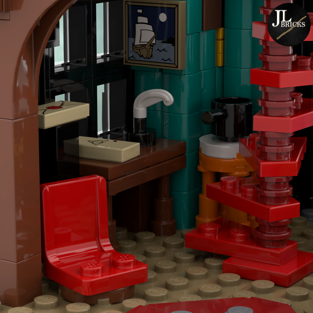 On the ground floor you will find the kitchen and a small table. Xenophilius' office is located on the first floor, including an old printing press currently printing the Quibbler (sticker). Also included is a bust of Rowena Ravenclaw and multiple books.