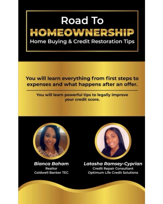 The home-buying process can be challenging, even for those who have purchased a home before. "The Road to Homeownership" is an 80-page ebook designed to make the home-buying process easier for potential homeowners by providing home-buying and credit restoration tips to assist you on your journey to homeownership. Contact myself, Bianca Baham, at biancabaham@gmail.com or Latasha Ramsey-Cyprian at info@optimumlifecreditsolutions.com for your home-buying and credit restoration needs.