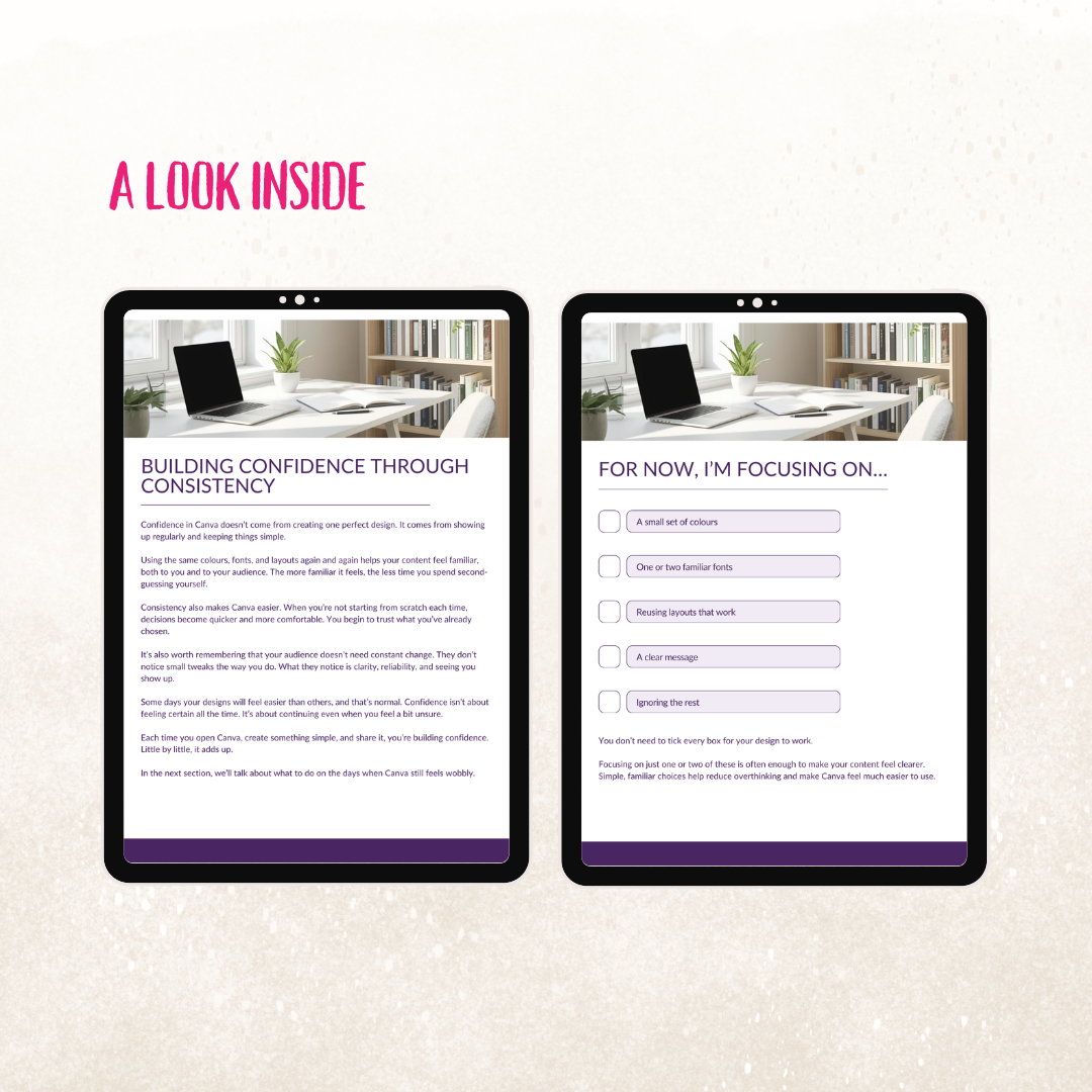 Rather than teaching Canva step by step, this guide focuses on reducing overthinking, simplifying decisions, and helping you trust yourself when creating content.