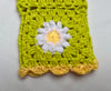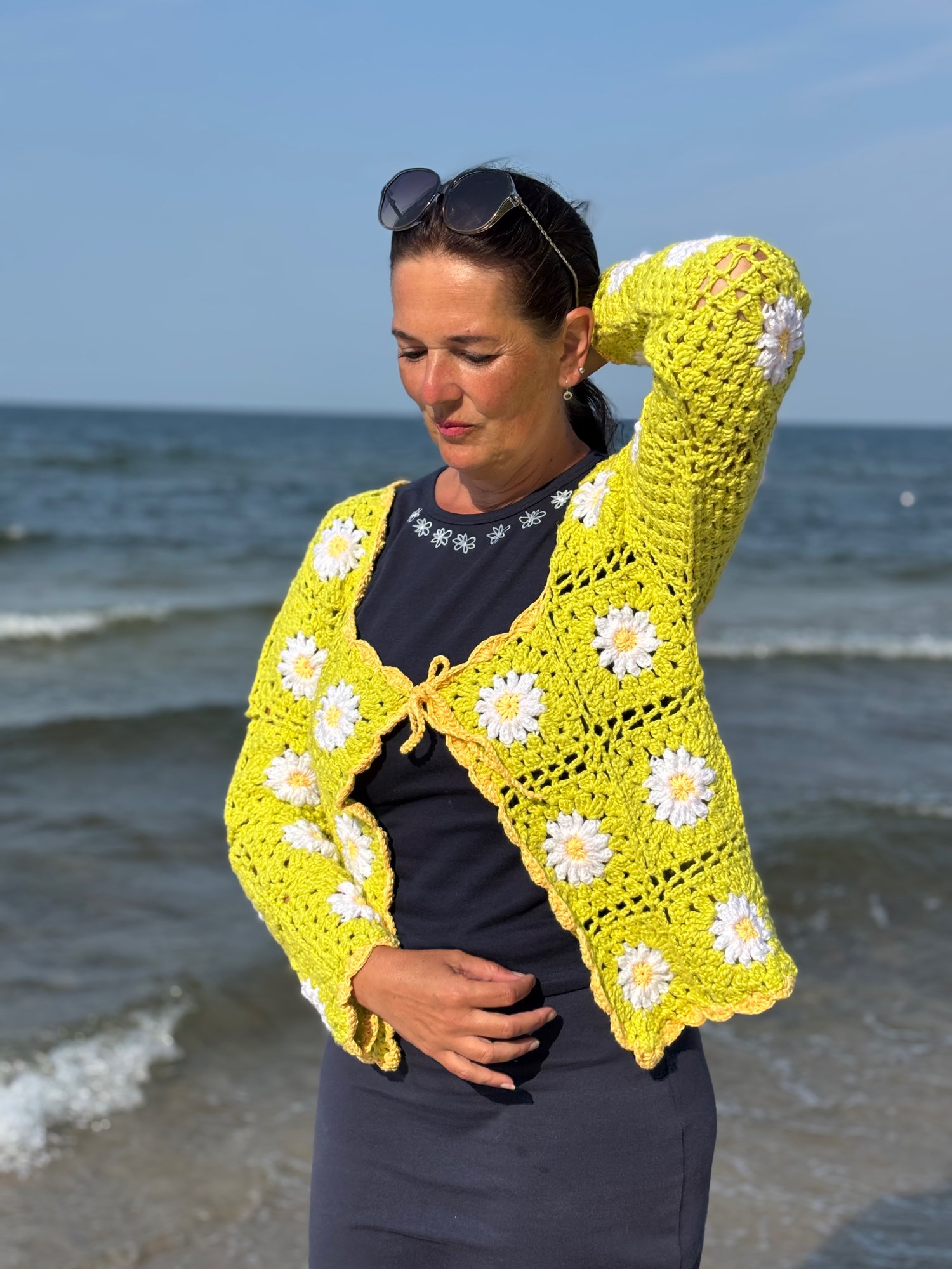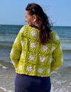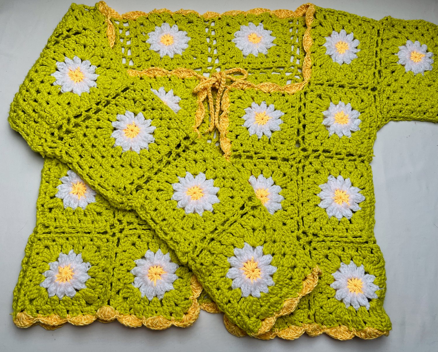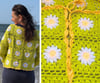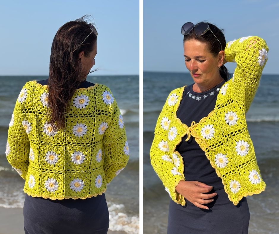 The sweater is crocheted from individual granny squares, making it a fun and original project. Each square has a daisy in the center with a yellow middle and white petals. The petals are crocheted with a relief stitch that gives them a beautiful 3D effect.