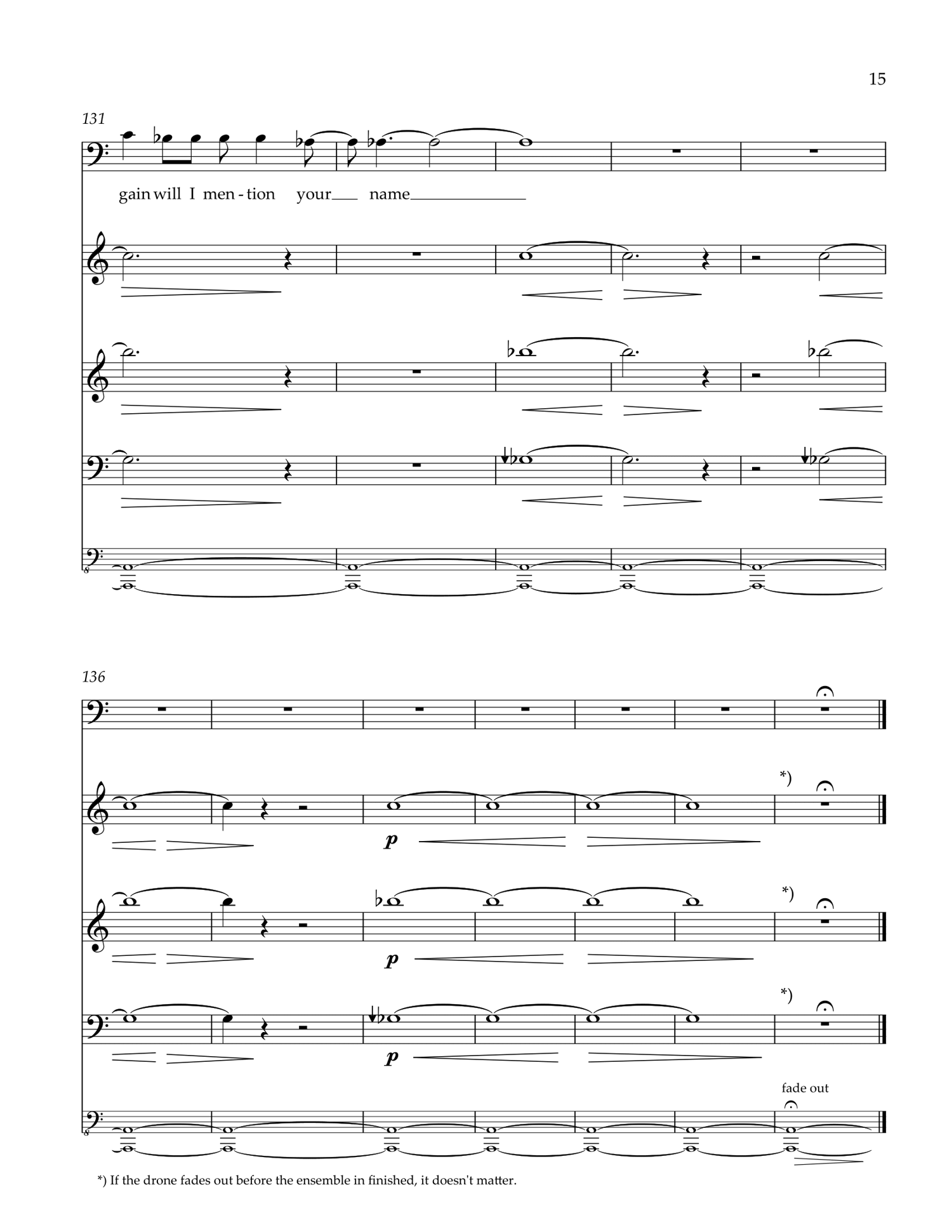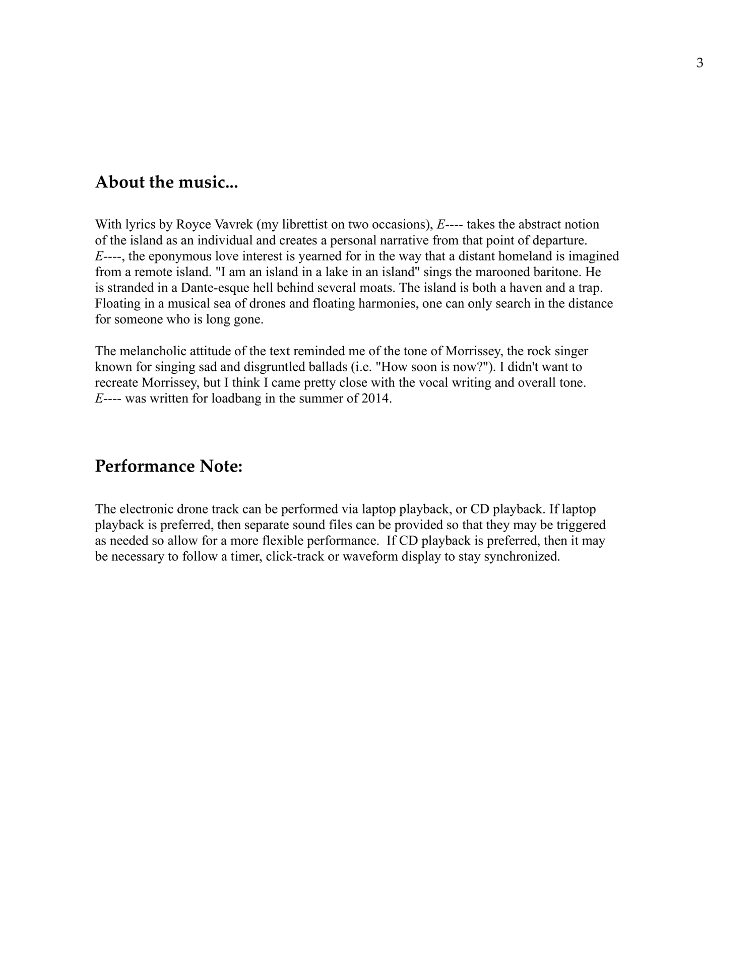 The melancholic attitude of the text reminded me of the tone of Morrissey, the rock singer known for singing sad and disgruntled ballads (i.e. "How soon is now?"). I didn't want to recreate Morrissey, but I think I came pretty close with the vocal writing and overall tone. E---- was written for loadbang in the summer of 2014.