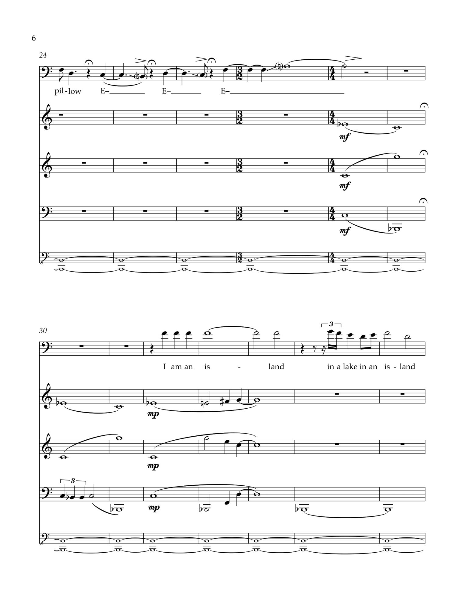 With lyrics by Royce Vavrek (my librettist on two occasions), E----takes the abstract notion of the island as an individual and creates a personal narrative from that point of departure. E----, the eponymous love interest is yearned for in the way that a distant homeland is imagined from a remote island. "I am an island in a lake in an island" sings the marooned baritone. He is stranded in a Dante-esque hell behind several moats. The island is both a haven and a trap. Floating in a musical sea of drones and floating harmonies, one can only search in the distance for someone who is long gone.