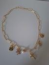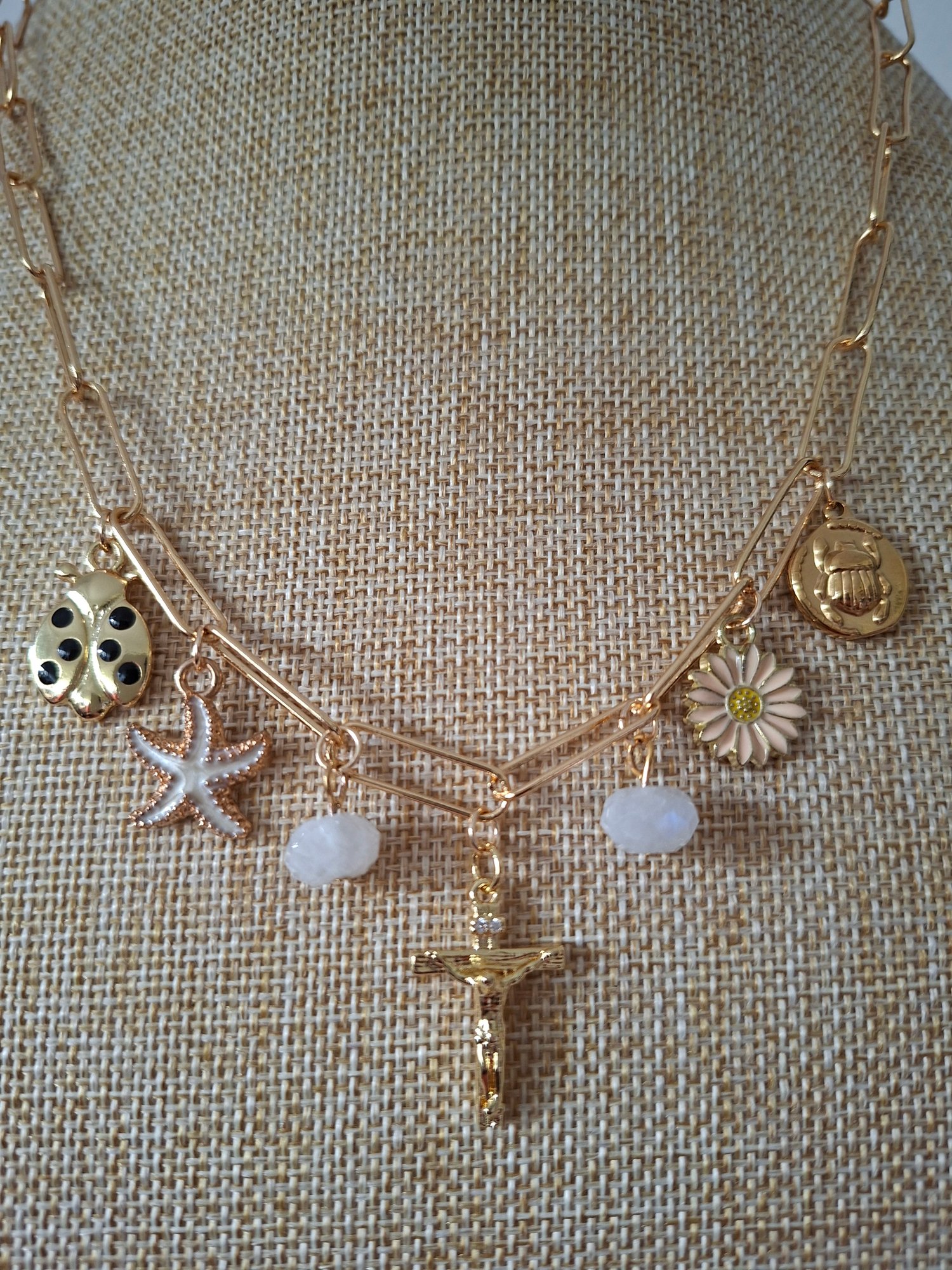 Sa chaîne en acier inoxydable doré accueille plusieurs grigris qui apportent une touche de magie et de féminité.