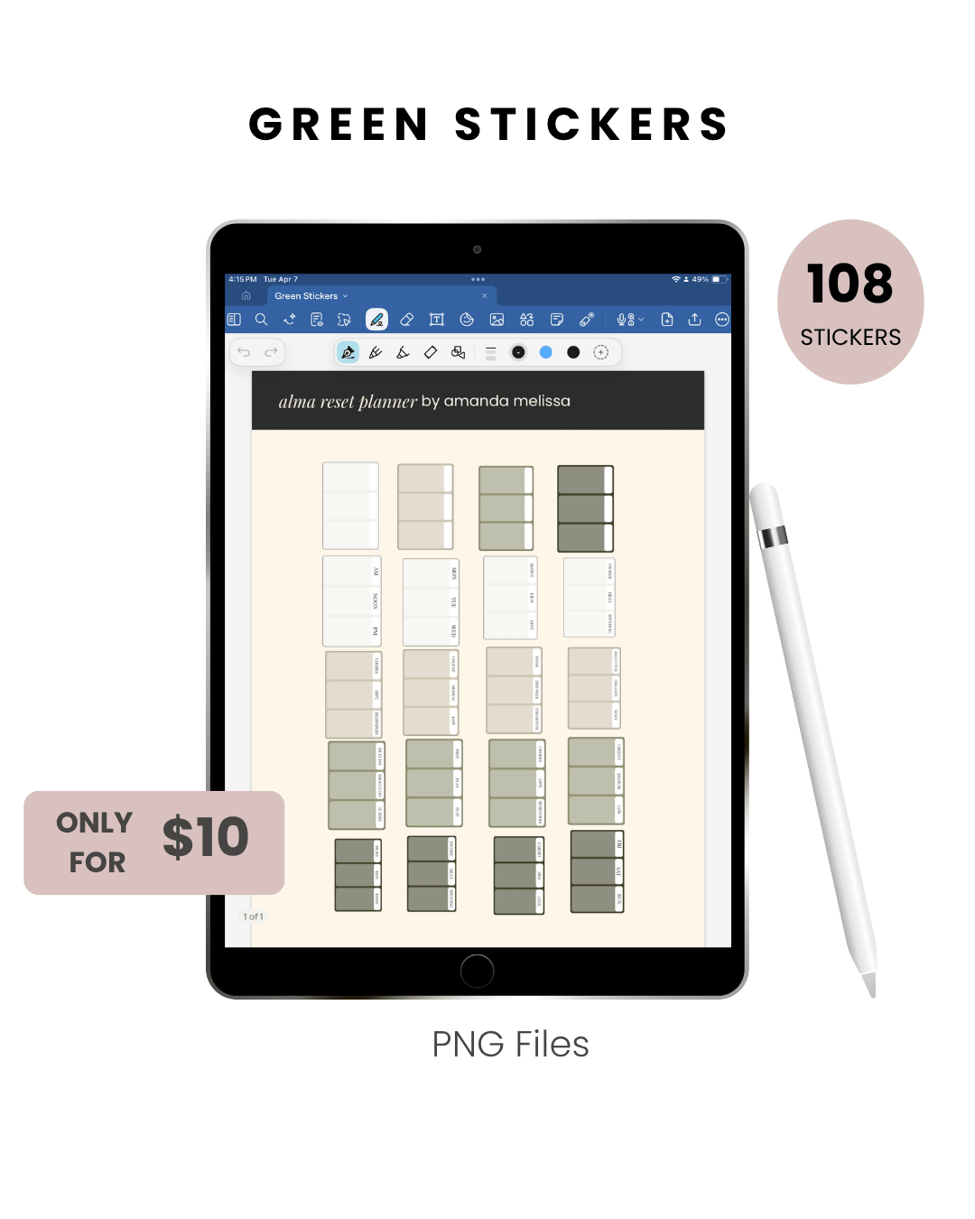 108 PNG File Digital Stickers. Organic green stickers.